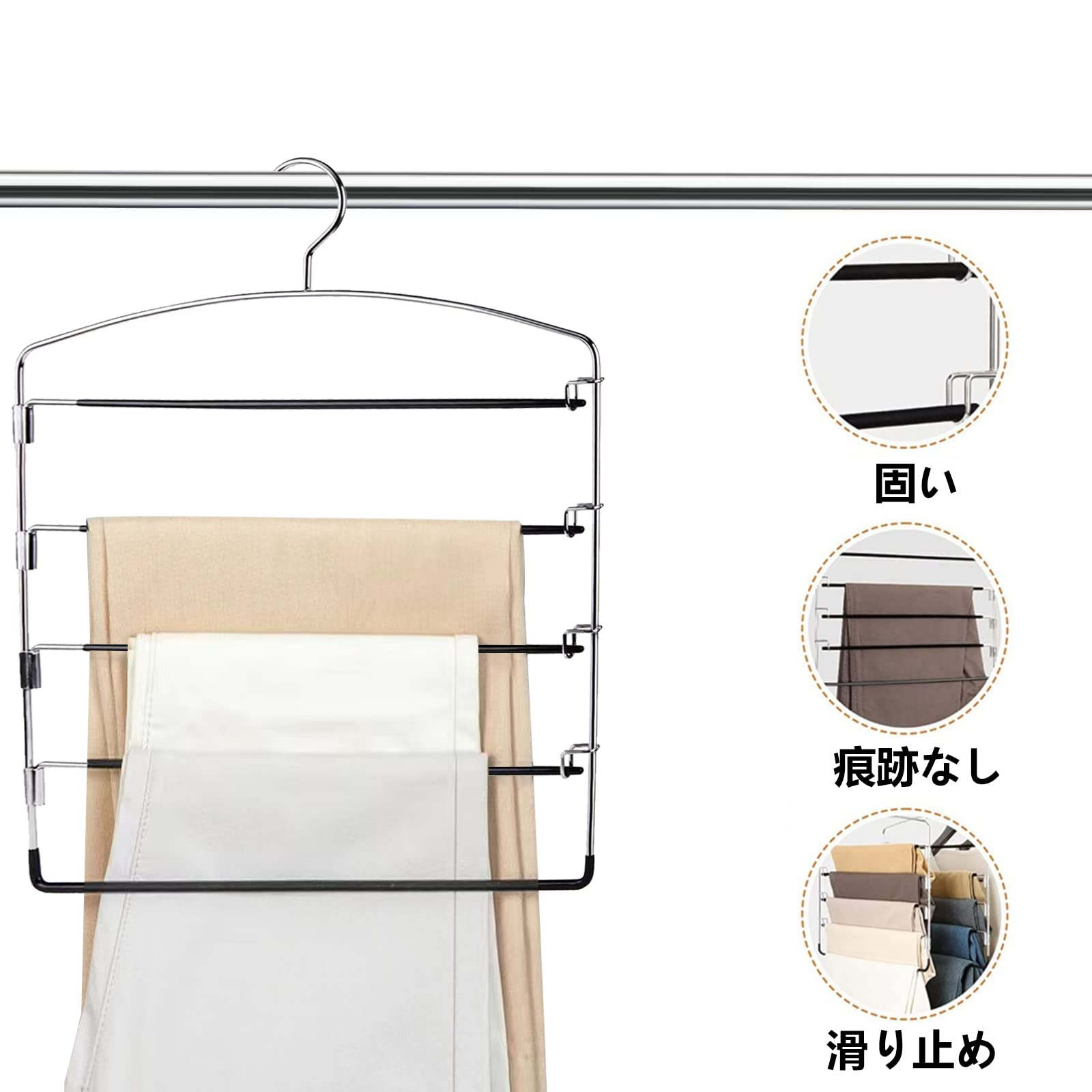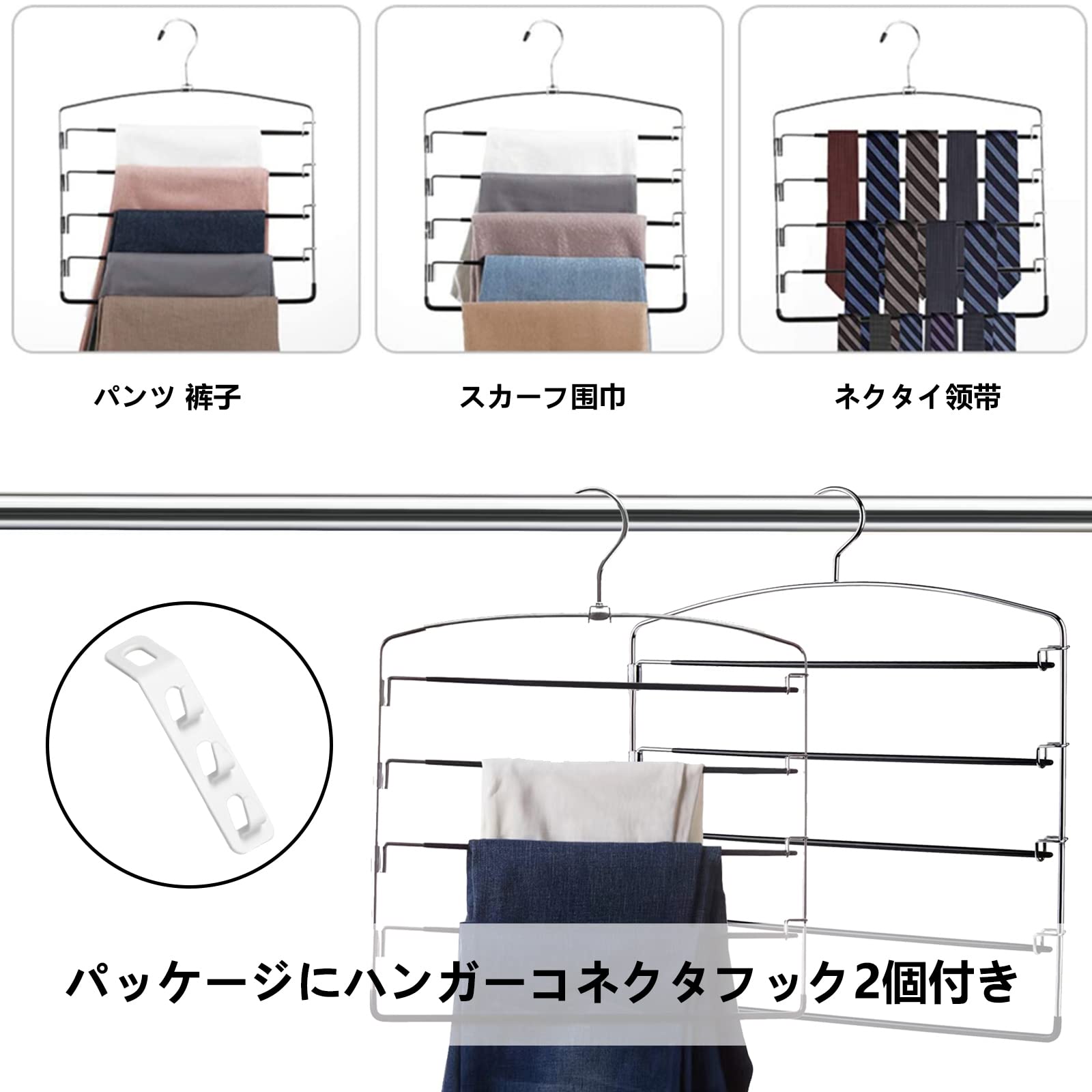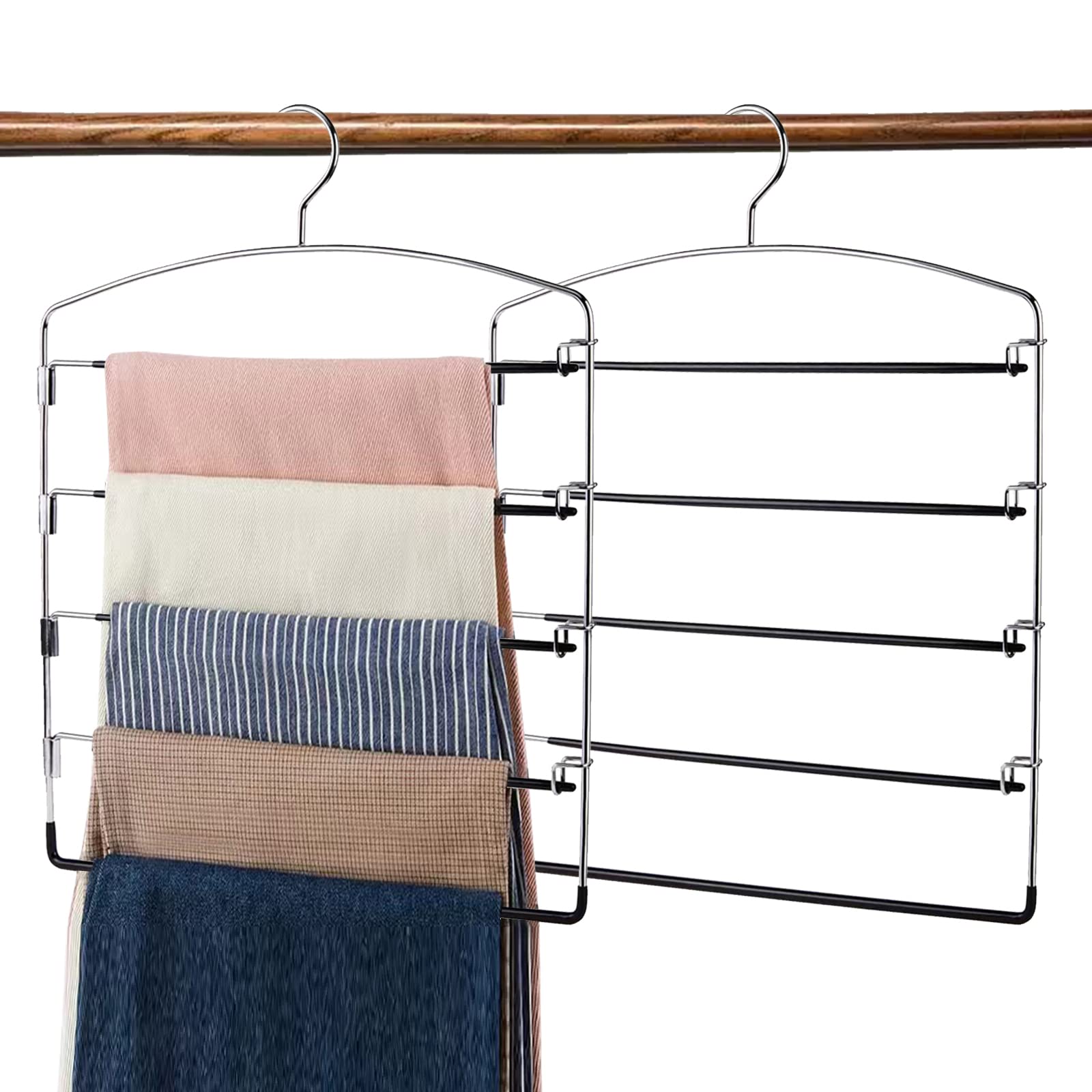 2本 ズボンハンガー 5段 スラックスハンガー クローゼット収納 コネクター すべらない 360°回転 ステンレスハンガー 跡がつかない 省スペース ズボンスラックス ジーンズ スカート ノンスリップ 家庭 押し入れ収納