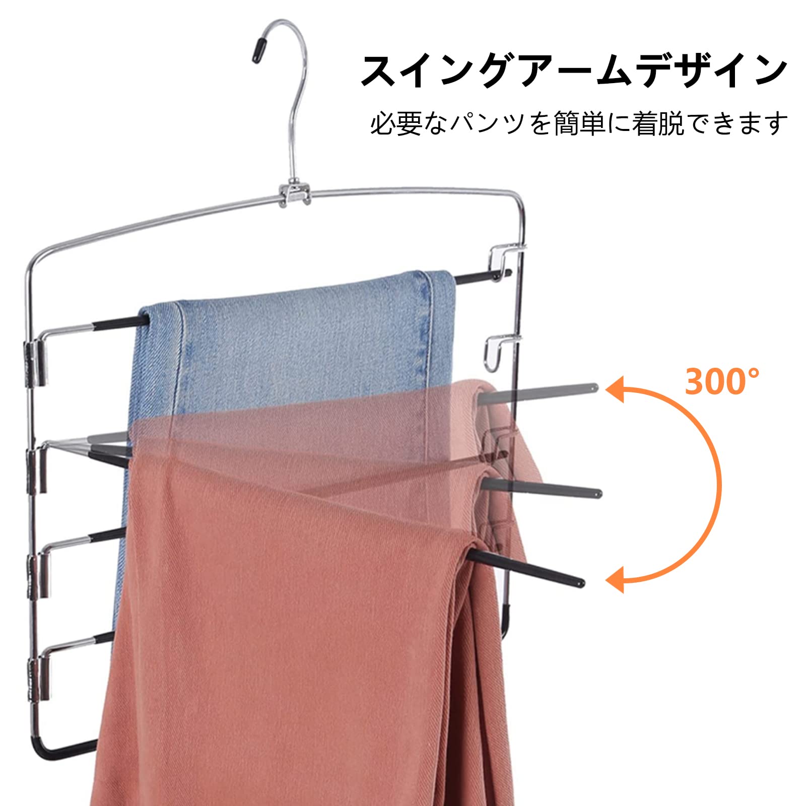 【360°回転スラックスハンガー】各ズボンは1つスラックスハンガーに収まり、ズボンやスカートは一目瞭然です。それにこのハンガーは360°回転フックと300°移動できるバーの設計で、ズボンの出し入れが便利になり、ほかのズボンを動かさないでご希望のズボンを取れます。