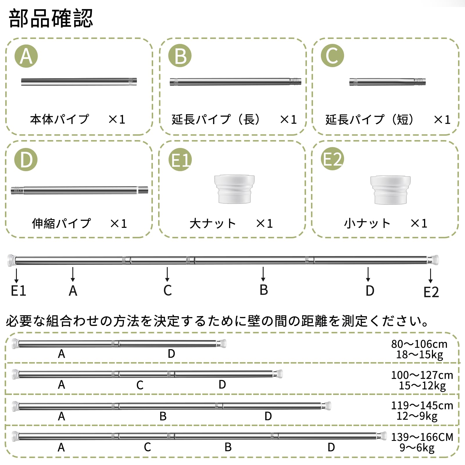 80cm~166cmの両壁距離を対応でき、つぎ合せ式のステンレス製のつっぱり棒は対応できる距離が長いだけなく、運賃を減らすので、さらにお得になります。
