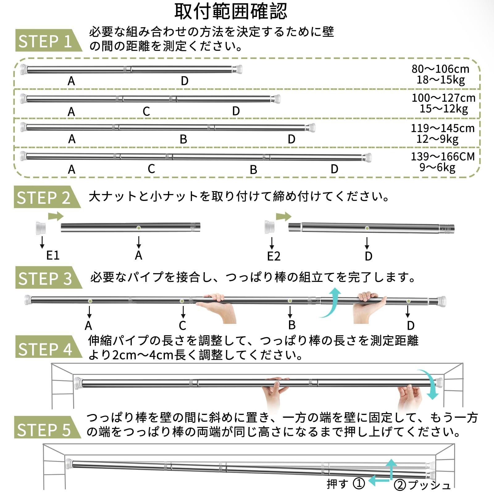 耐荷重拔群:使用する長さによって耐荷重も違いです、長さが短いほど耐荷重が強くなります。80cm〜166cmは18kg〜6kgを対応できます。