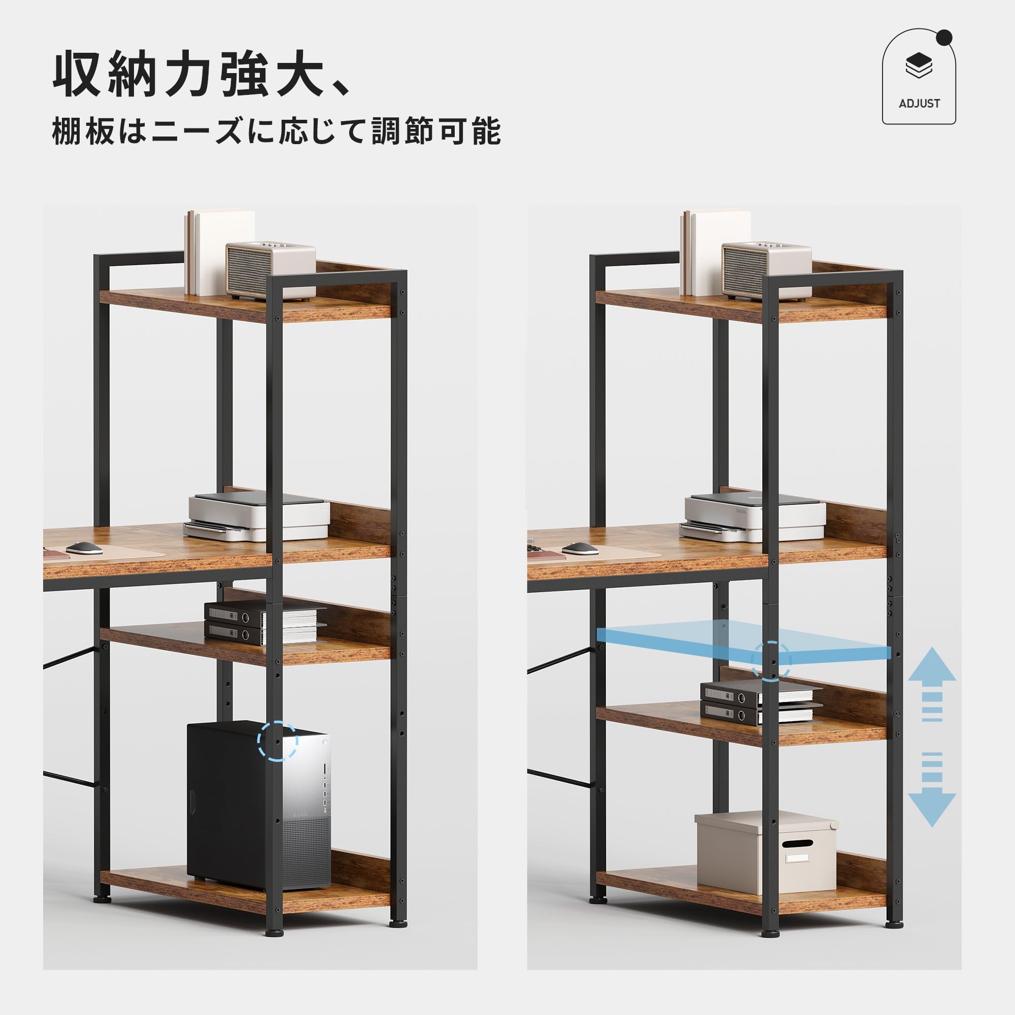 大容量棚付きで収納力 UP:棚付きデスクの設計で、機の側面に大容量 4 階層の棚を備え。棚側面には?板があり、小物や書籍などを整理しやすく、落下を防ぎます