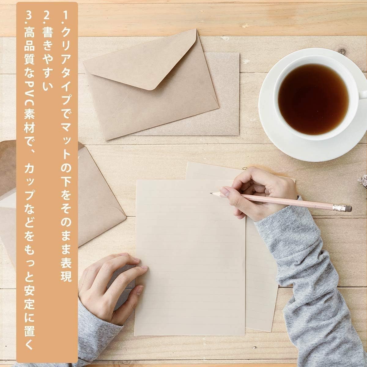 【多機能】シボ入り「ノングレア」(反射抑制、半光沢、エンボス加工)半透明PVC素材を使用しており、目に優しいマット、A4用紙収納可能、カレンダーやスケジュール、メモ、コピー用紙などを整理して見やすく整理するのに最適なデスクマットです。テーブルマットを受け取って開けたら、重いものを角に置いて24時間平らにすると、テーブルマットは平らになります。