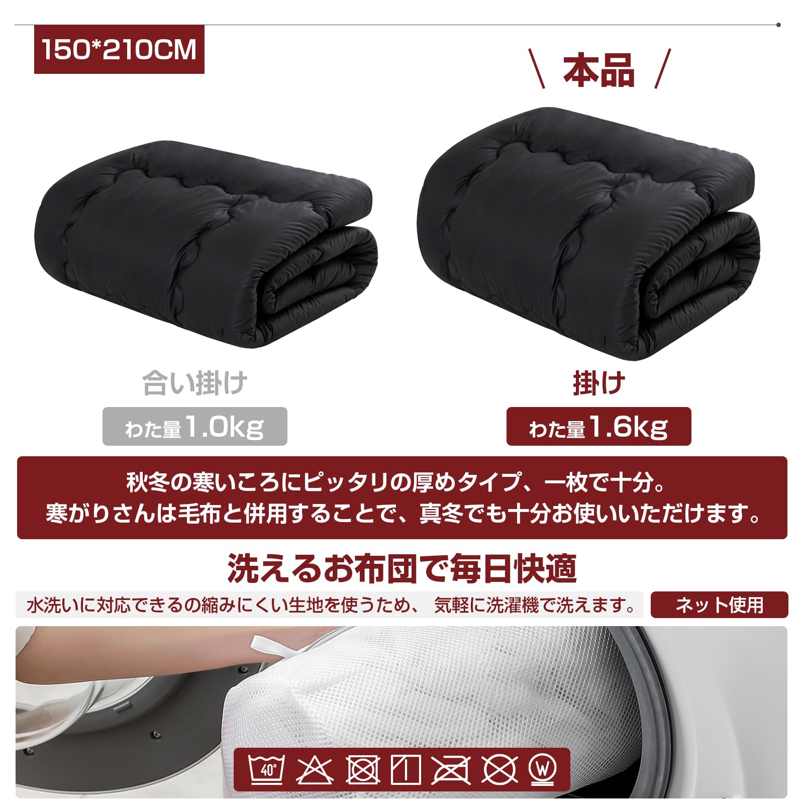 【 丸洗いOK】ご家庭でのお洗濯可能(洗濯機で丸洗い、手洗いできる)。ポリエステル生地とポリエステル綿を使っているので、一般的な綿を使った肌掛け布団に比べると乾きが早く※洗濯する場合は洗濯ネットに入れて洗ってください。