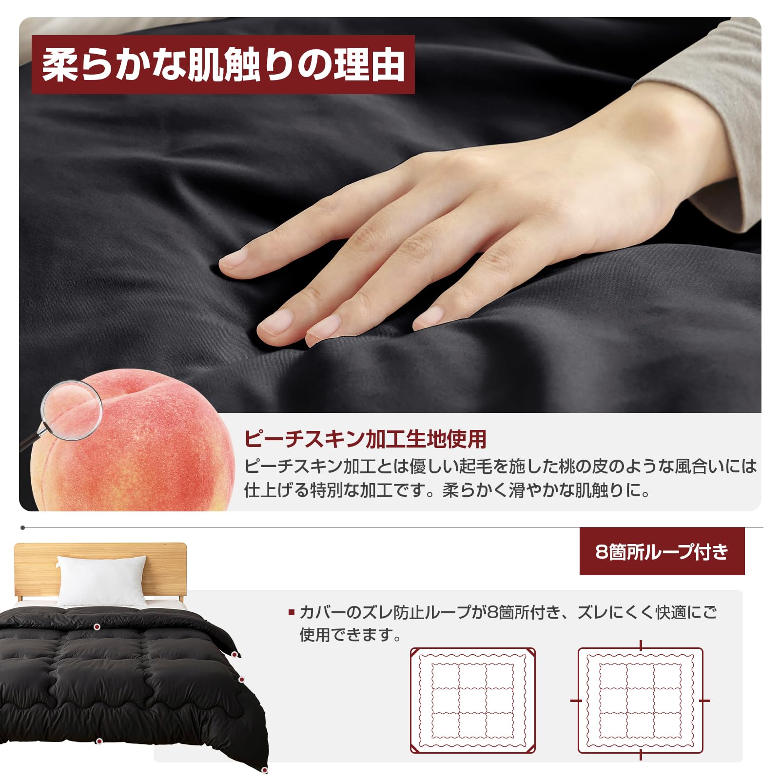 【ピーチスキン加工・冬掛け布団】桃のようなソフトタッチで、素肌に触れてもやわらかく心地いいです。静電気抑制(防止)加工で乾燥な季節でもご心配なく使用できます。なお、デリケートなお肌の方、お子様にも安心してお使いいただけます。