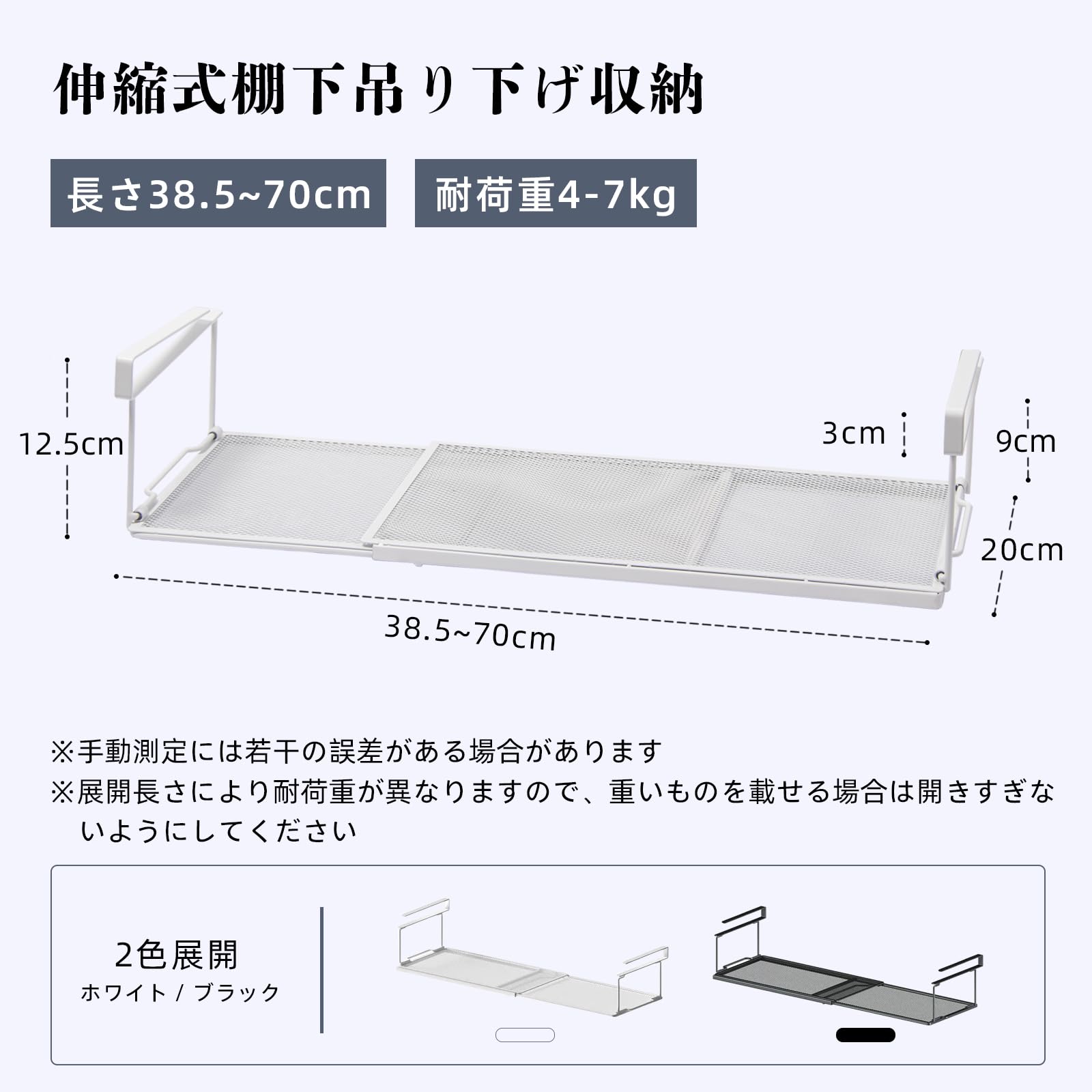 【製品の寸法】:キャビネット下の棚の寸法は20 x 12.5 x (38.5~70) センチメートルで、約0.93キログラムのネット重量です。厚さが最大2.3センチの棚に適しており、高さが最大9センチのアイテムを収納できます。最大耐荷重は約7キログラムです。