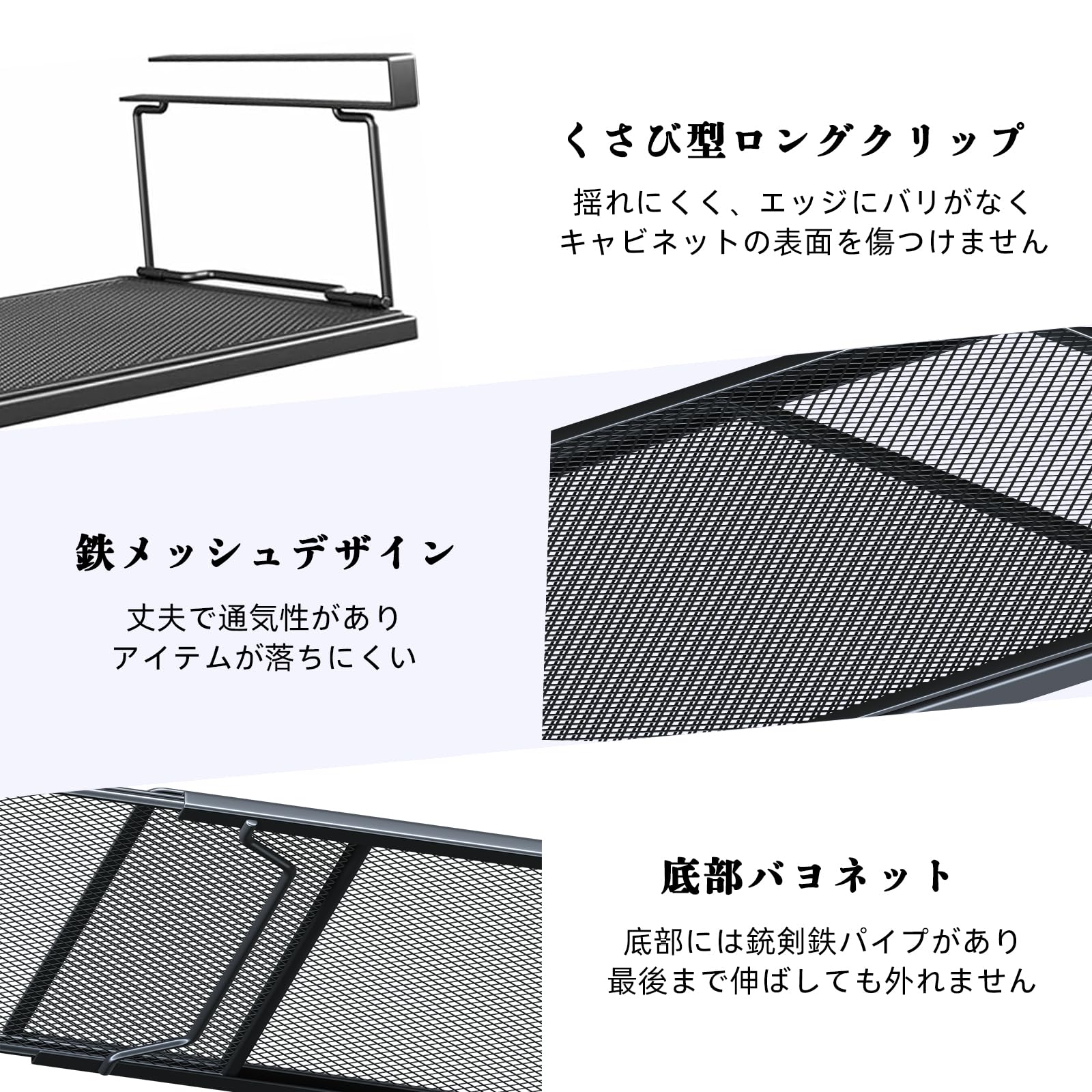 【安定して傾かない】:吊戸棚は高品質な炭素鋼で作られており、細かい金属メッシュ表面がアイテムに安定したプラットフォームを提供します。クリップはくさび形状で、長さは6.5センチメートル、棚にしっかりと掛かり、傾かないようになっています。