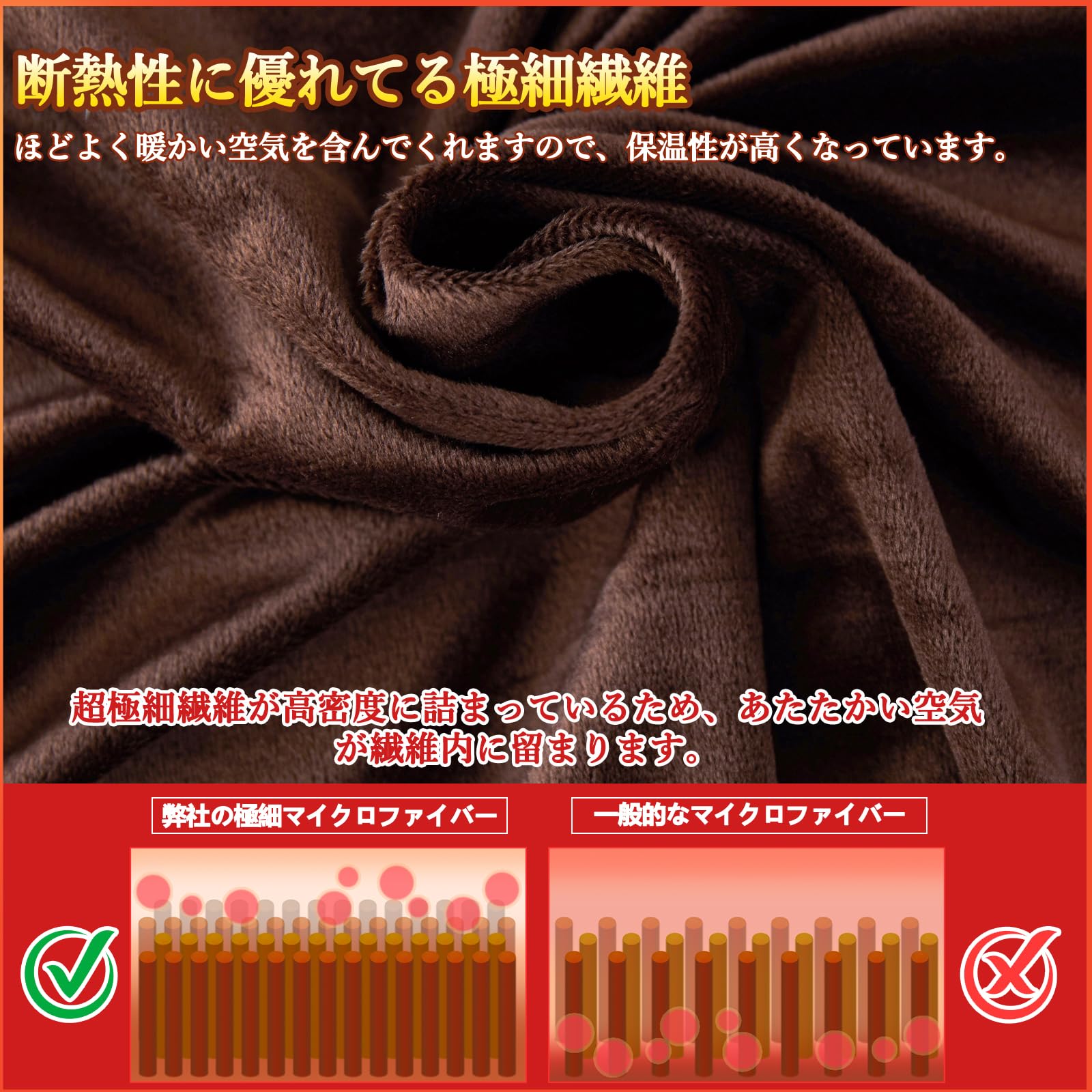 【吸湿発熱わた使用】寝ている間の汗を吸ってあたたかさに変え、しかもムレにくくなっているので、より保温性が高くなっています。従来のマイクロファイバーに比べて、繊維の目付けがしっかりしているので、使用に伴う毛玉や毛抜けの発生が少なくなっています。
