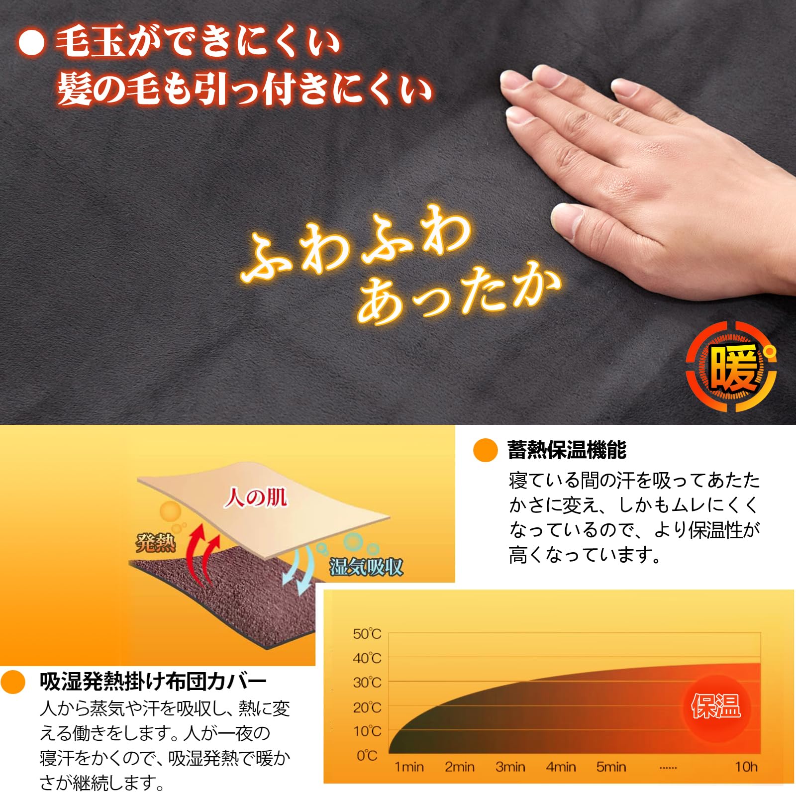 【あったか接触温感・蓄熱保温機能】肌ざわりのひみつ極細マイクロファイバーを高密度で編み上げた生地のカバーは布団に入った瞬間ヒャッと感がなく、入った瞬間からすぐに暖かさを感じる事できます。ほどよく暖かい空気を含んでくれますので、保温性が高くなっています。ぬくぬくの暖かさで、寒い時期には欠かせないアイテムです。