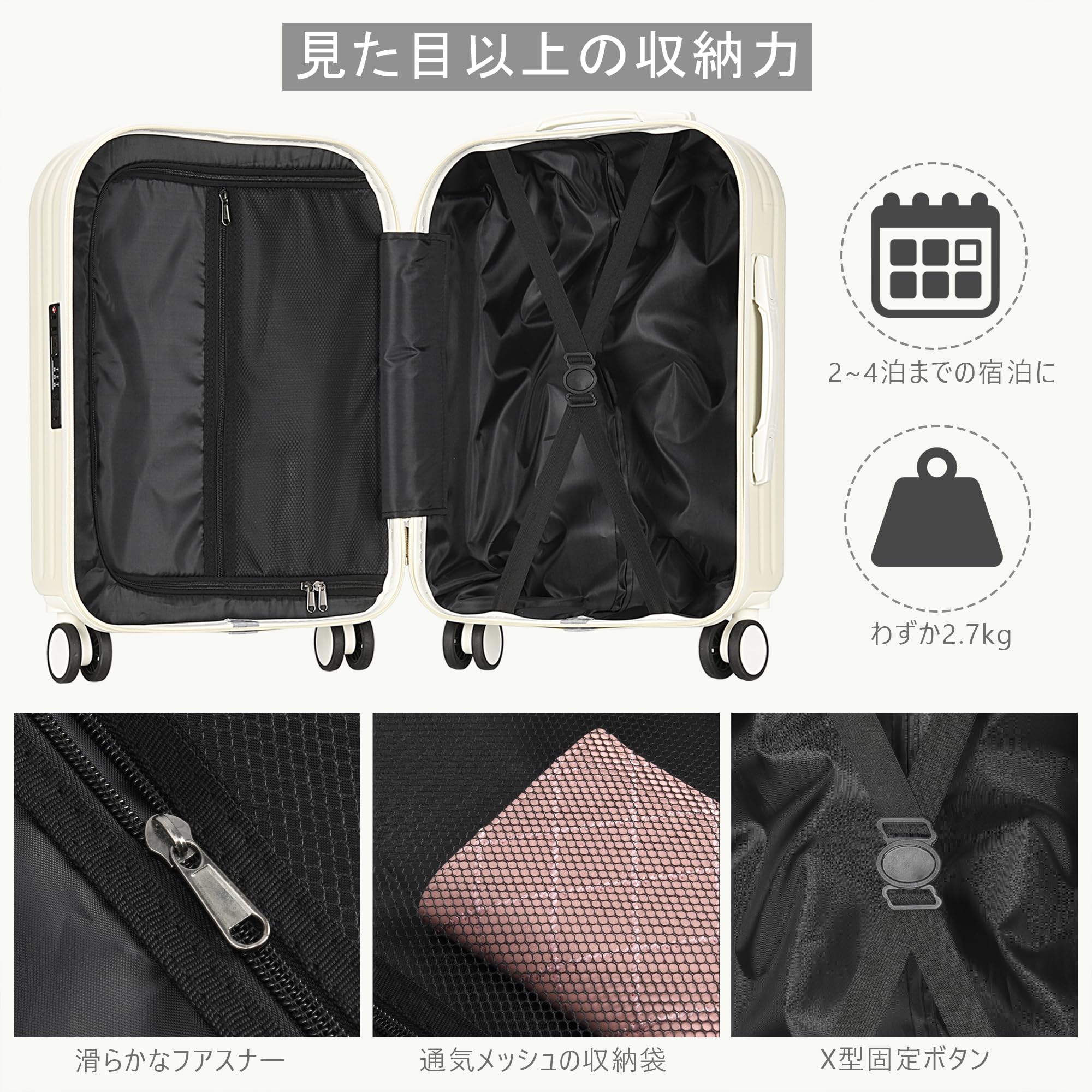 【製品仕様】Sサイズ:約W36×D22×H54cm 、 容量:約39L 、 重量:約2.7kg 、 機内持ち込み可、宿泊目安:2〜4泊 。Mサイズ:約W45×D24×H64cm 、 容量:約61L 、 重量:約3.9kg 、宿泊目安:4〜7泊 材質:ABS+PC(本体)、TPE(キャスター)