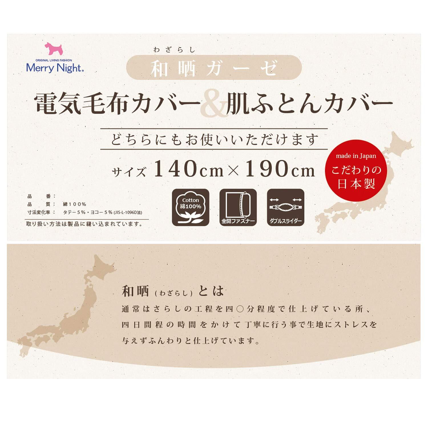 サイズは140×190cm、用途として「電気毛布」用の他にシングルサイズの「肌ふとん」や「キルトケット」用のカバーとしても利用できます。