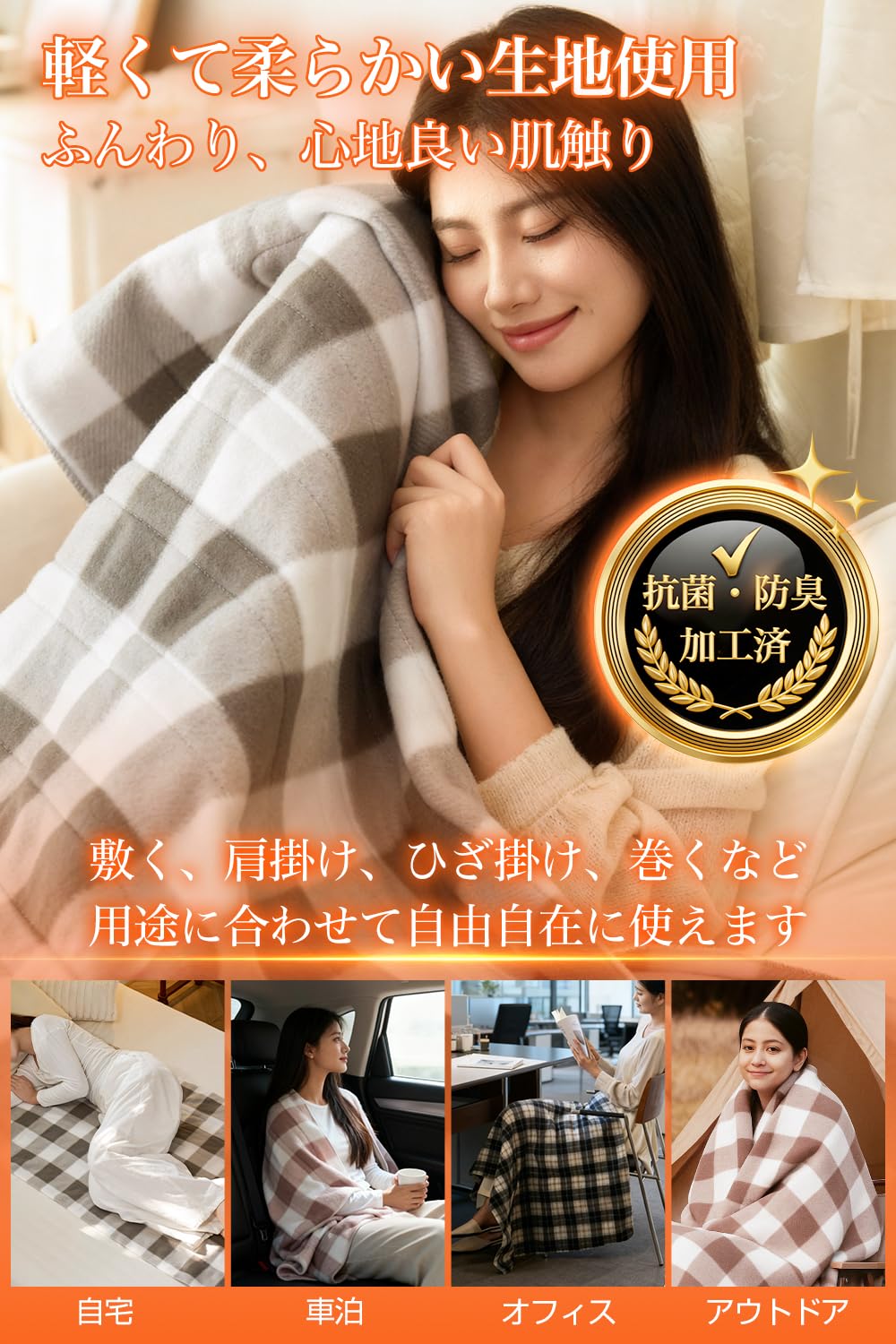 【優れた肌触り・保温性を持つ素材&抗菌防臭加工素材】裏表同じで起毛素材を採用、温まった空気をを逃がさず、寒い季節でも暖かさをしっかりとキープします。 また、柔らかくて極上の肌触りでふんわりと癒され、あったか快適な冬を!!さらに、抗菌防臭加工を施し、細菌の繁殖やにおいを抑えます。140x80cmの大判サイズ、掛け毛布、敷毛布、膝掛け、肩掛けなど様々な使い方ができます。