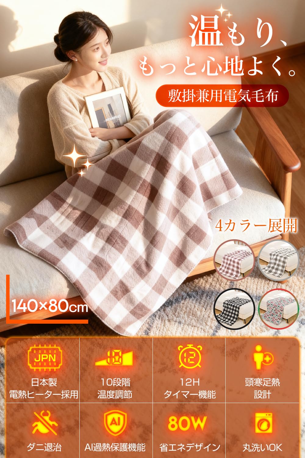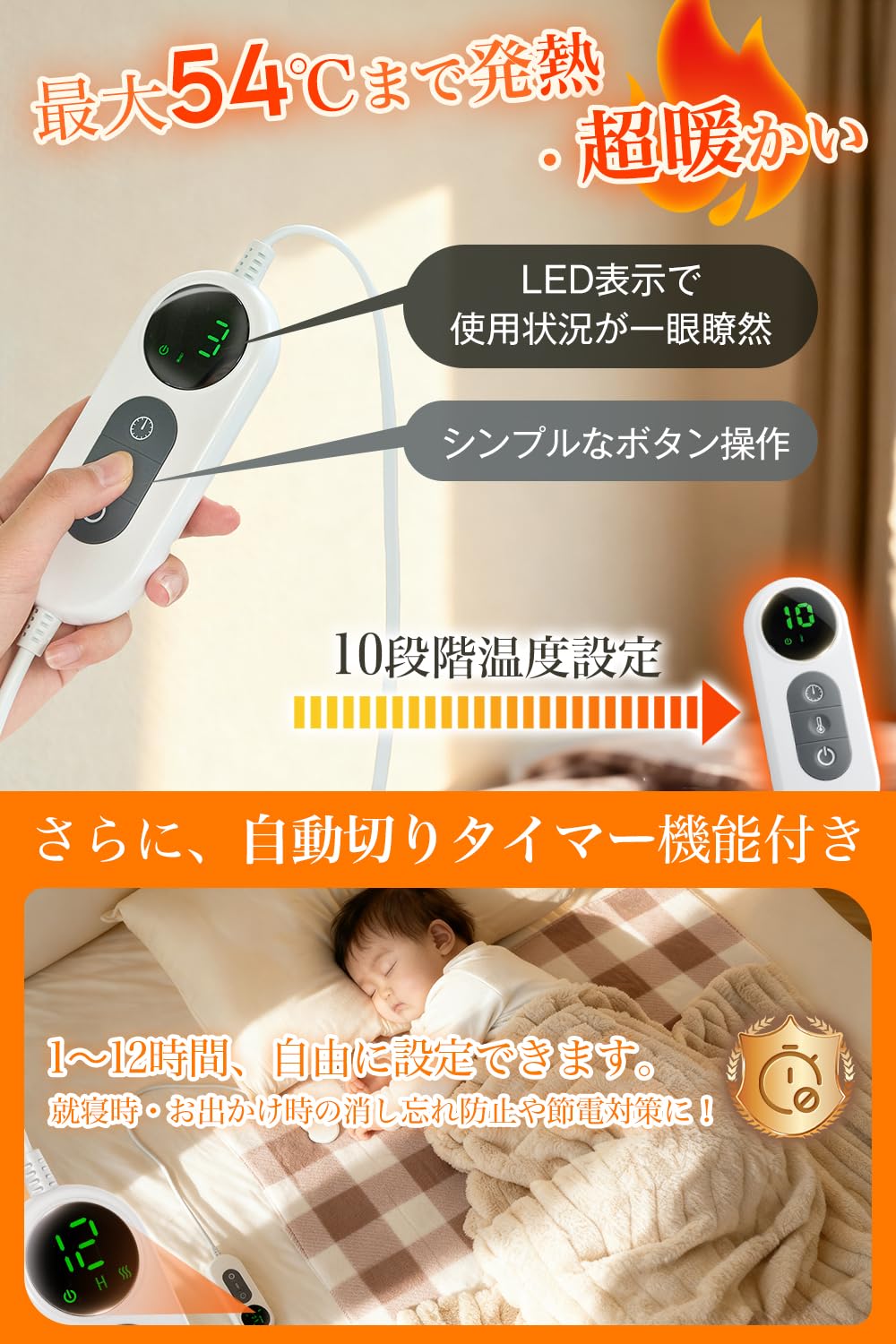 【安全性パッチリ!AI過熱保護&タイマー付き】温度センサーを内蔵し、リアルタイムで温度を検知し、AIが温度をコントロールして維持してくれます。過熱を防ぎ、安全性パッチリ!!また、この電気毛布 タイマー付き 、1-12Hの範囲で1時間単位で自由に設定できます。寝ている間に熱くなりすぎる心配もなく、快適な睡眠をとることができます。電気毛布の消し忘れや電気代の節約にも役立ちます。
