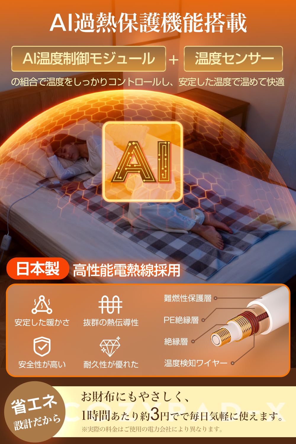【温もりで体を包み込んで極寒な日もぽかぽか快適】cozypad-X敷き掛け兼用 電気毛布は抜群の熱伝導性、安全性を持つ日本製高性能電熱線採用、均一で安定して素早く暖められます。また、10段階温度調整可能(30℃〜54℃)、環境温度、好みに合わせてムダなく温度を設定できます。最大54℃まで発熱でき、極寒な日も暖かく快適に過ごせます。 そして、頭寒足熱を意識した配線デザインで、冷えやすい足元はしっかりと、 胸元はソフトに温めることで、 快適な睡眠をサポートします。気になる電磁波の発生を90%低減させる設計を採用、長時間安心して使用できる電気ブランケットです。