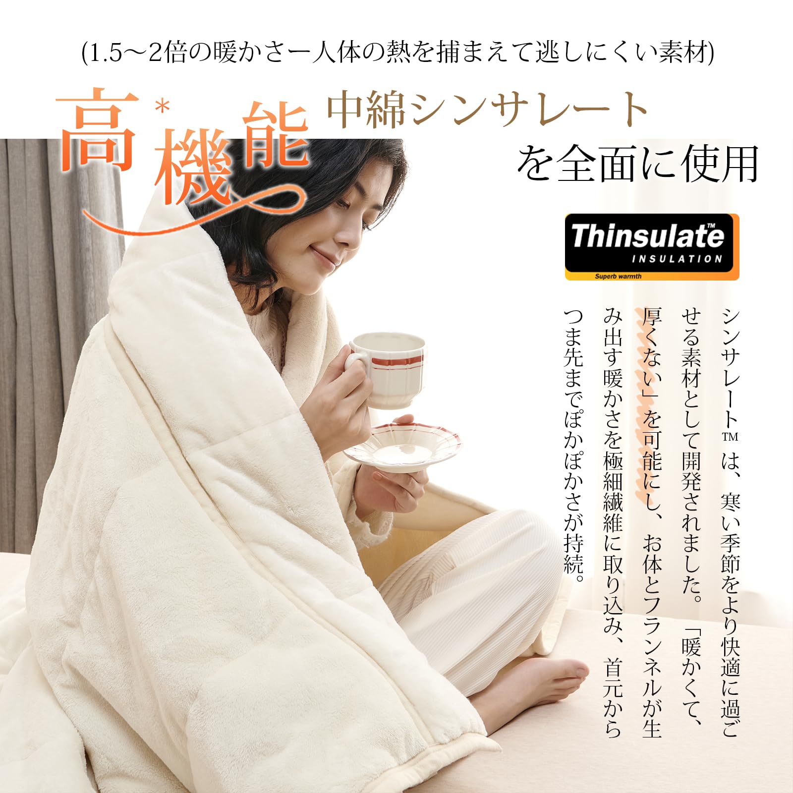 【4層構造で保温力倍増!】上層と下層はなめらかな肌触りのフランネル毛布で、その間にシンサレート綿と吸湿発熱中綿を挟んでいる。2枚合わせのサンドイッチ構造だから優れた断熱効果があり、保温性もより良い。保温力たっぷりの冬用毛布!
