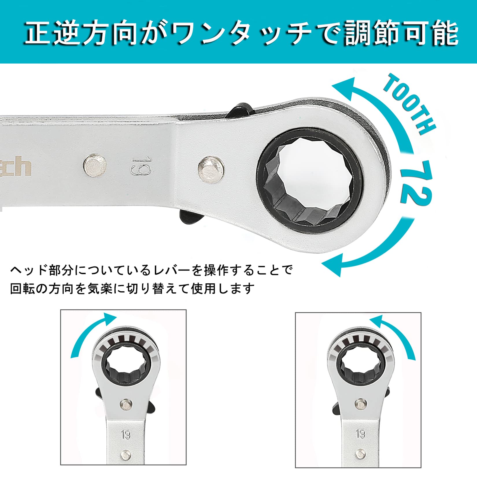 【ラチェットレンチ】本製品はギアを搭載して連続的に回せます。サイズによって、ギアが違います。6mmレンチが18ギア、8mmレンチとレンチが17ギア、12mm、13mm、14mm、15mm、17mm、19mmレンチは20ギア、21mmレンチが22ギアです。