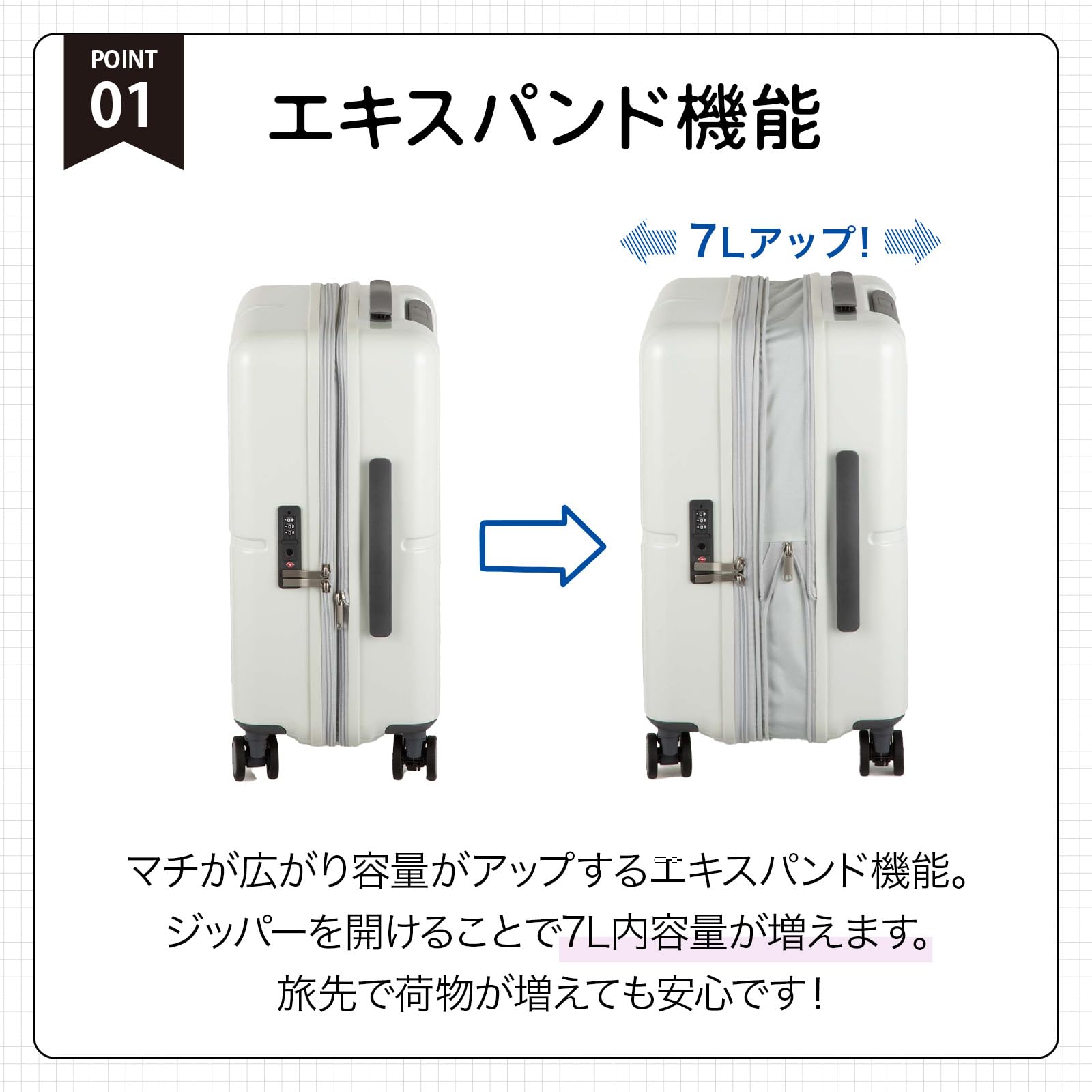 容量がアップするエキスパンド機能や、坂道や電車で活躍するキャスターストッパー、