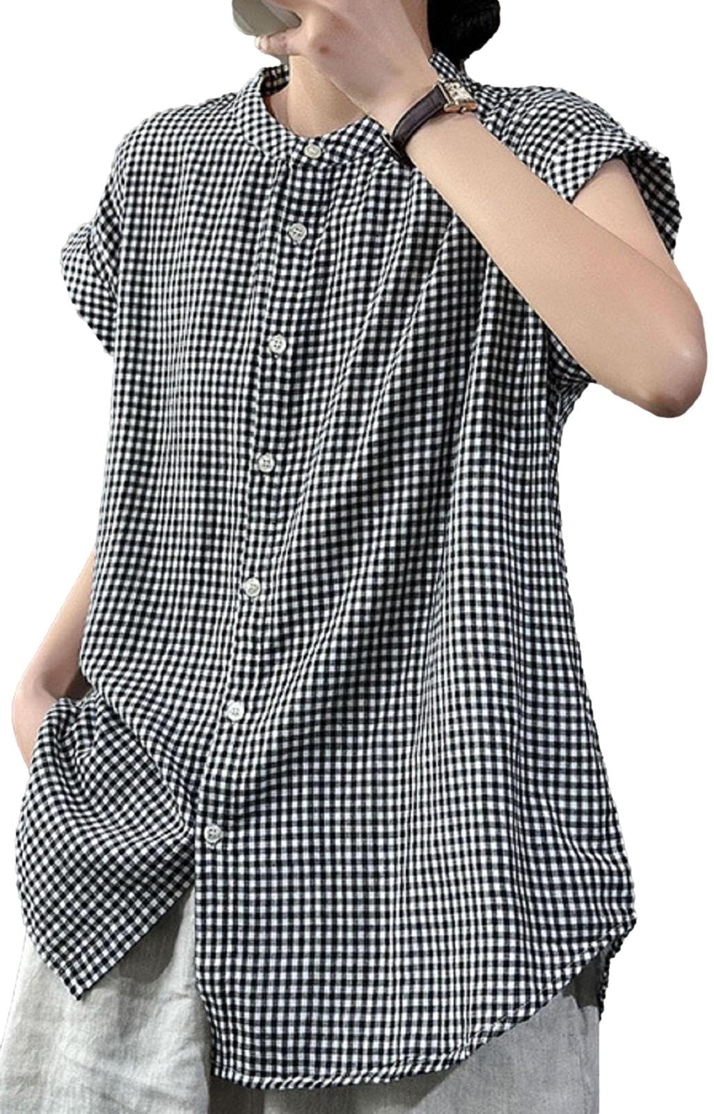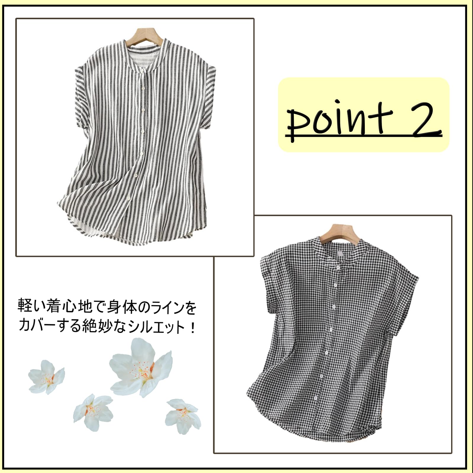 【新着特価】[andrei] アンドレイ シャツ バンド カラー フレンチ スリーブ 半袖 前開き 涼しい ブラウス 無地 チェック ストライプ レディース
