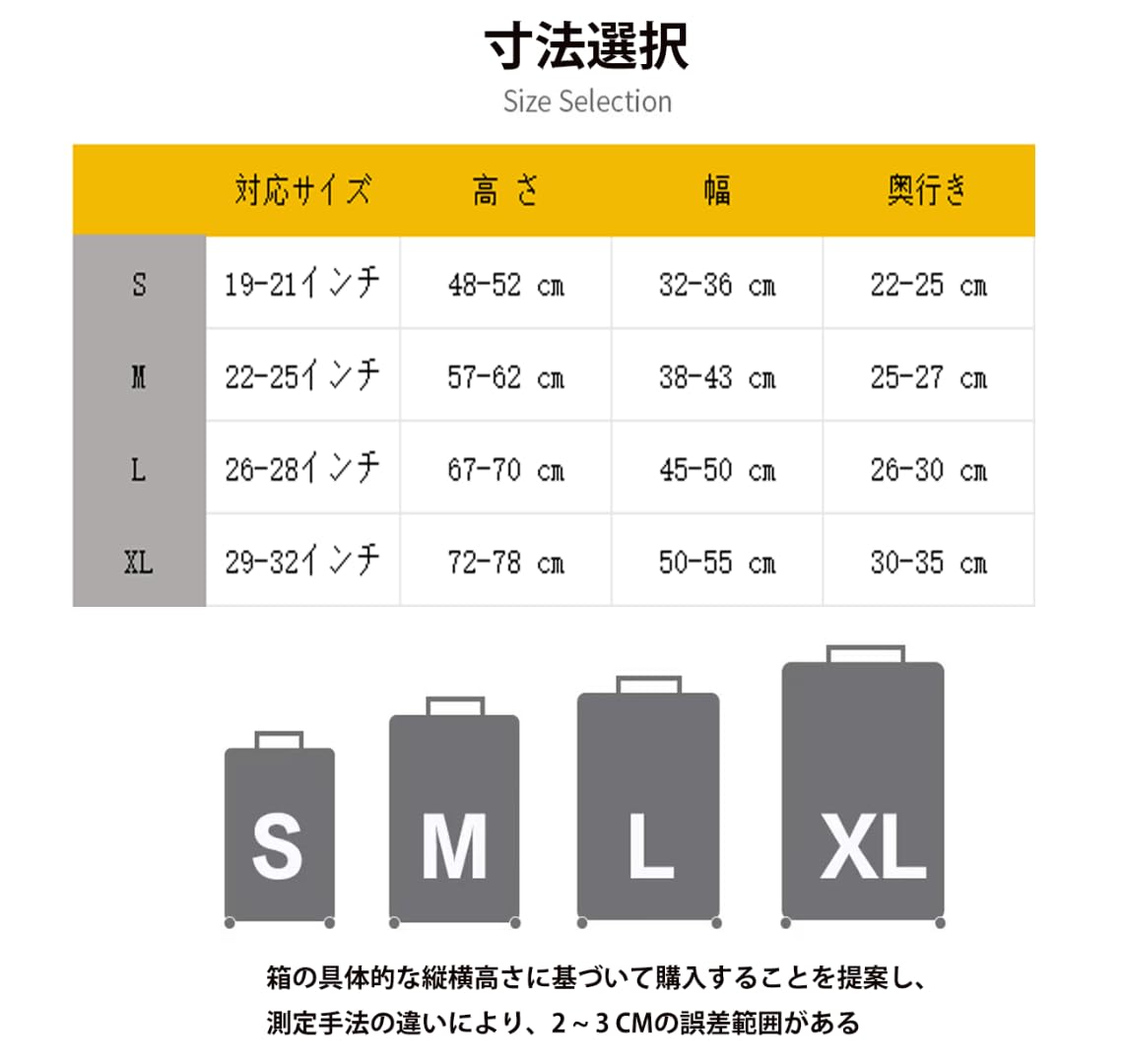 【有効効果】たいまもう素材を使用して作られて、ホコリ、汚れ、傷付きなどを防止できるし、。スーツケースの汚れや傷付き防止用の保護カバーです。大切なスーツケースを長く綺麗な状態を保ってくれます。