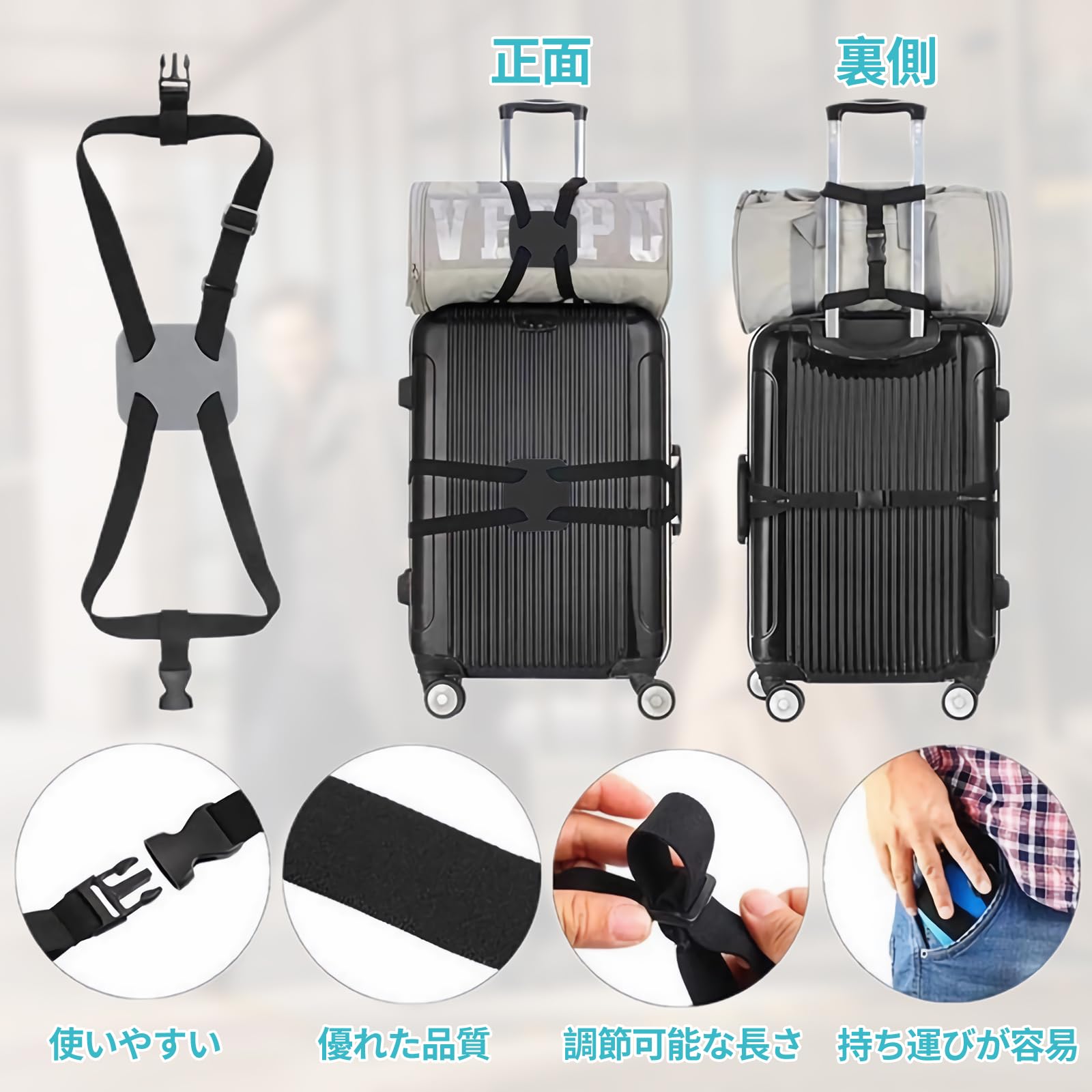 【バッグ落ち防止】バッグやリュックをスーツケースの上に置いて新幹線を乗って、落下のことがよく発生します。このスーツケースベルトは荷物をスーツケースのハンドルに固定して、安定性を高める。