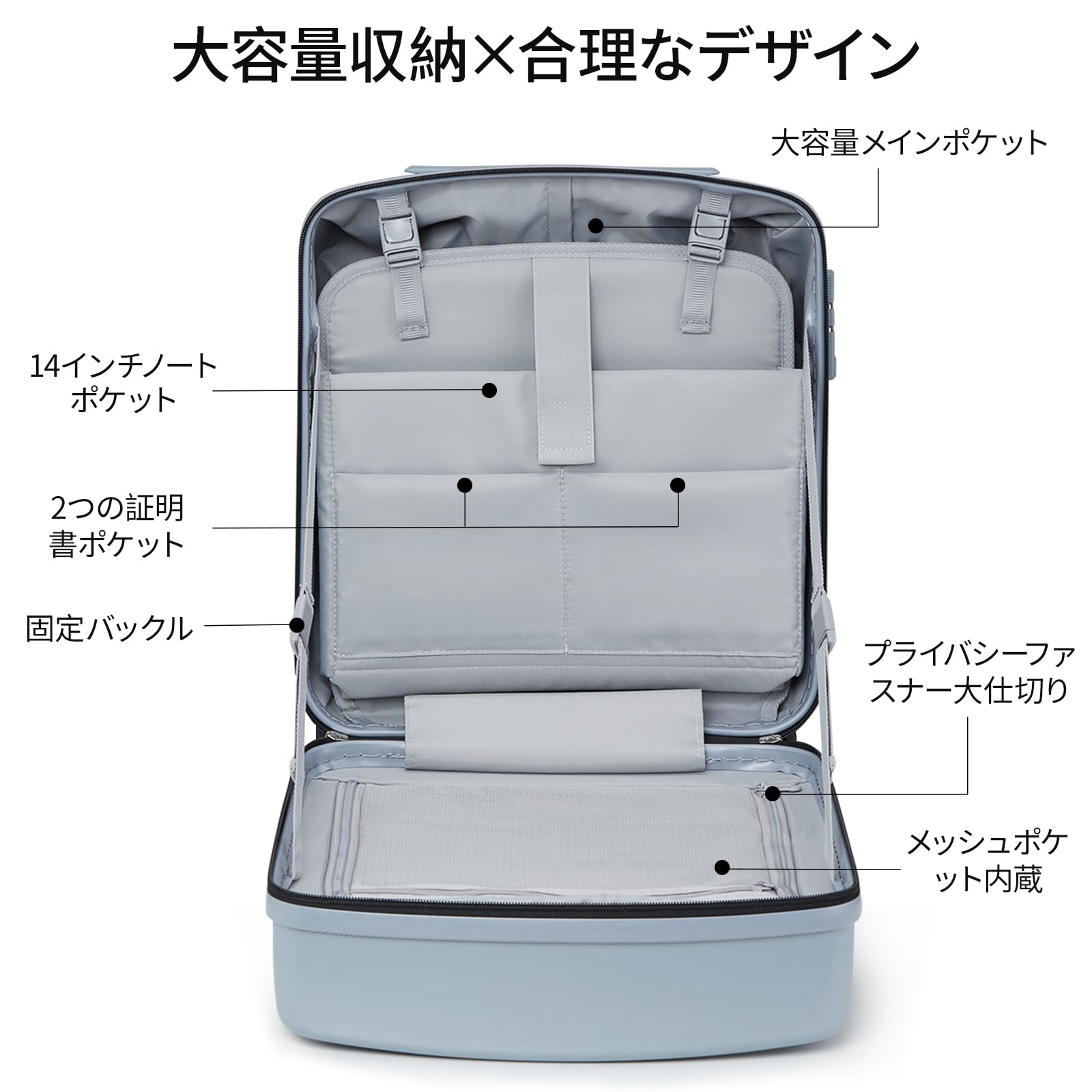 【広い内部空間】キャリーケース 荷物を持ち歩き、裏地がそろっているので、衣類の梱包に便利です。閉鎖式ファスナー仕切りはプライバシーをよりよく保護することができ、メッシュポケット付き個別収納設計、証明書ポケット、小物を保管するのに役立ち、ノートPC保護ポケット付き 旅行 ビジネス 出張用。