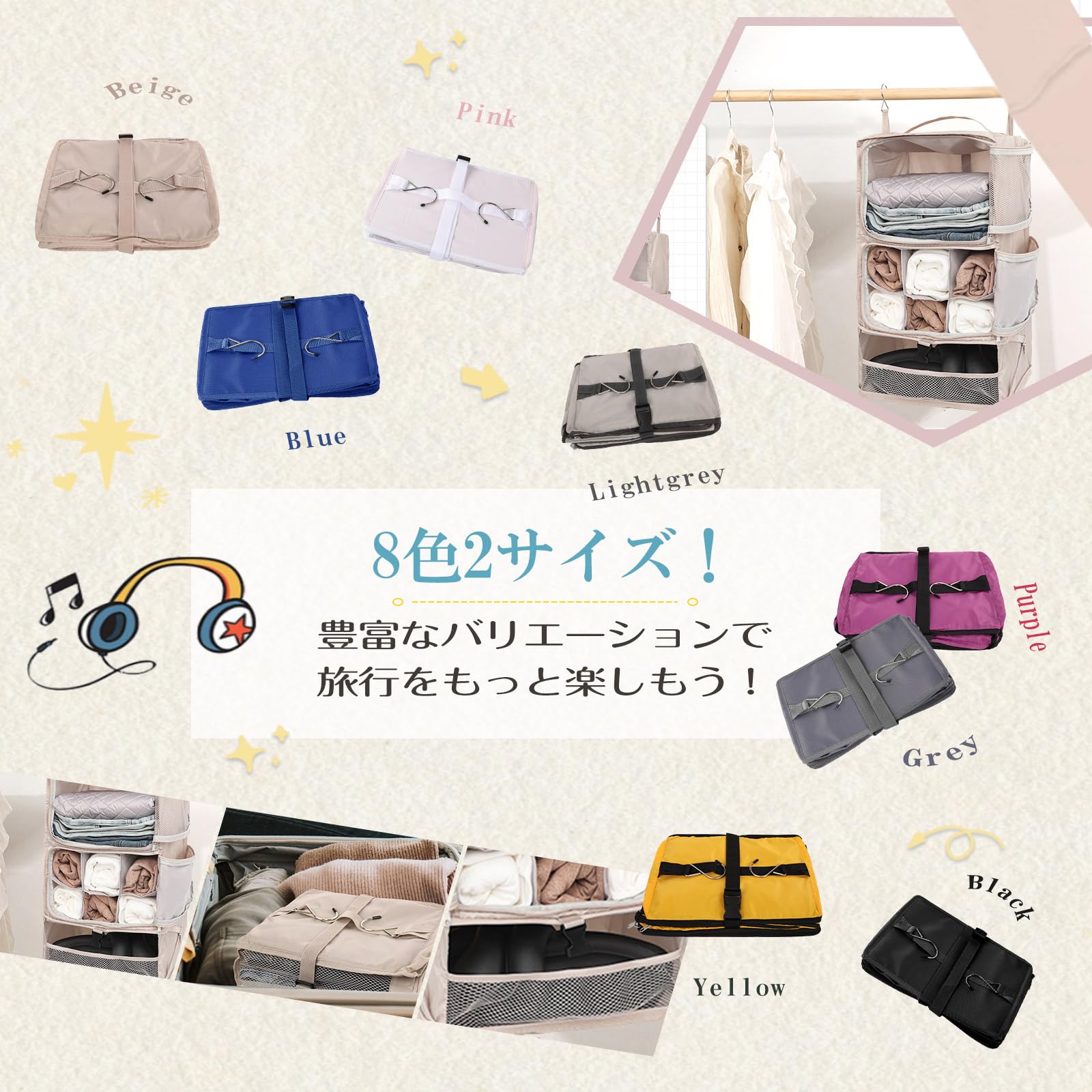 【素材】ポリエステル 【カラー】ブラック ブルー グレー ピンク ライトグレー ベージュ パープル イエロー 【吊り下げサイズ】XL:57*24*33CM XXL:62*32*42CM 【不使用時の折畳みサイズ】XL:24*33*3CM XXL:32*42*7CM