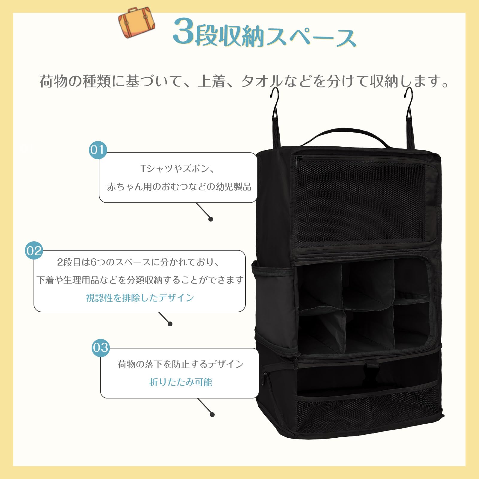【特価処分】TABITORA(タビトラ) 吊り下げ収納バック 収納ボックス トラベルポーチ 旅行グッズ 圧縮ポーチ 吊り下げ トラベルクローゼット インナーバッグ 整理収納 分類 衣類 服 洋服入れ 持ち運べる クローゼット 大容量 3段 たびとり 旅トラ 旅行 出張 (BLACK XL)