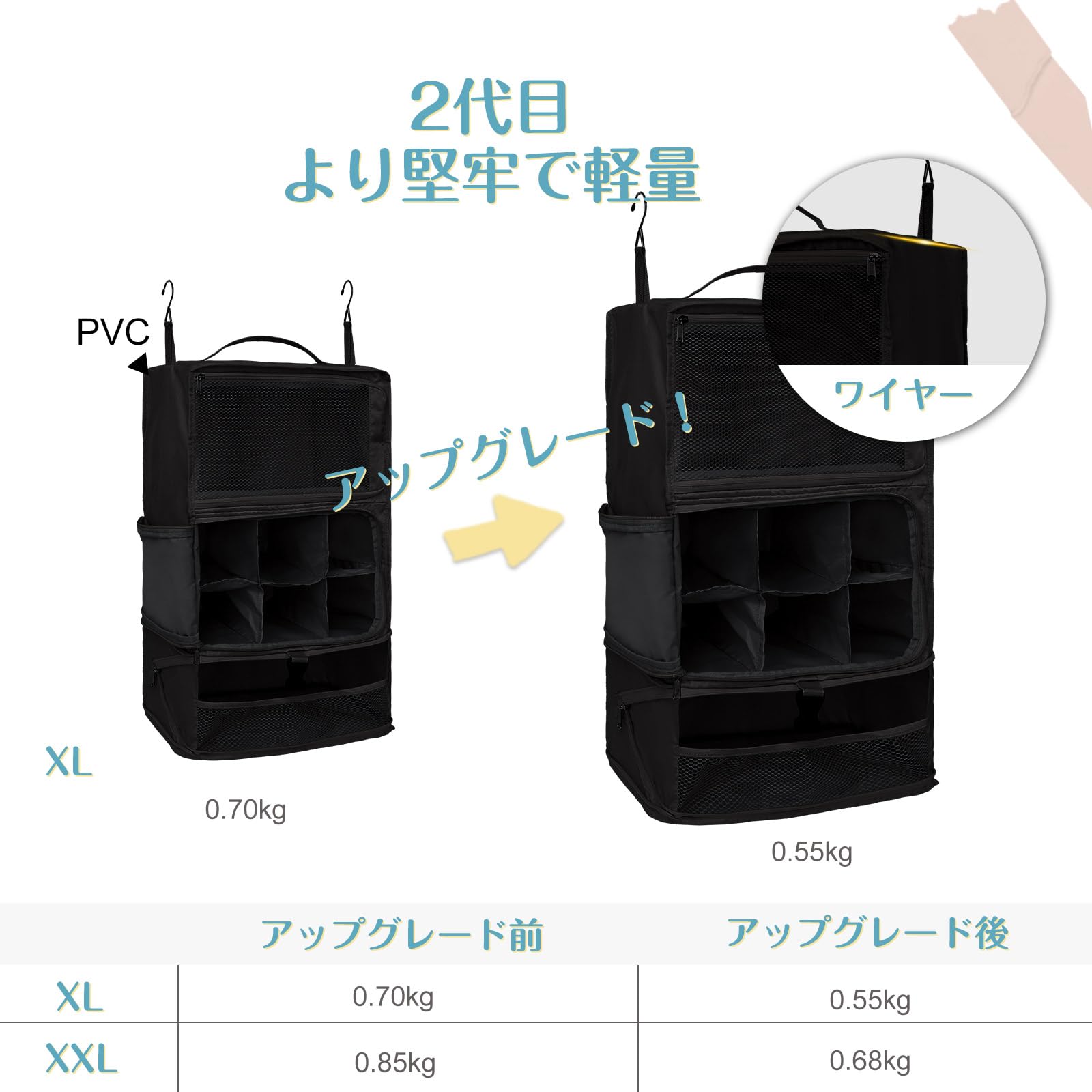【吊下げタイプ】吊下げタイプなので、壁掛けが可能で、中のものも一目瞭然で、入ることも取り出しも便利です。頻繁に出張に行く身としては非常に便利です。
