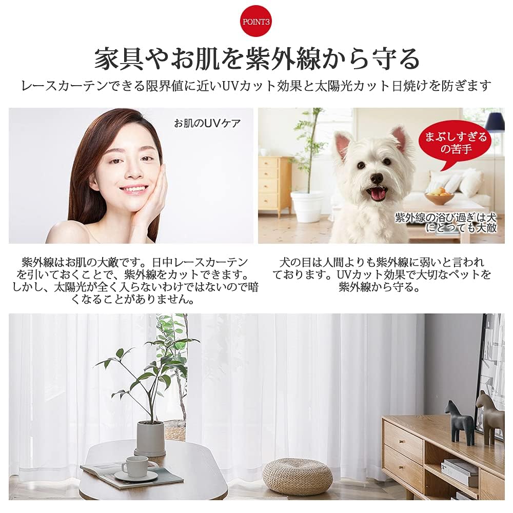 【UVカット&家具の日焼け防止に】特殊なUVカット繊維を使用し、紫外線による家具や床の色あせを防ぎます。毎日使うレースカーテンだからこそ、目に見えないダメージもしっかりケア。日差しが強くなる春夏にもぴったり!新生活のインテリアを長く美しく保てます。