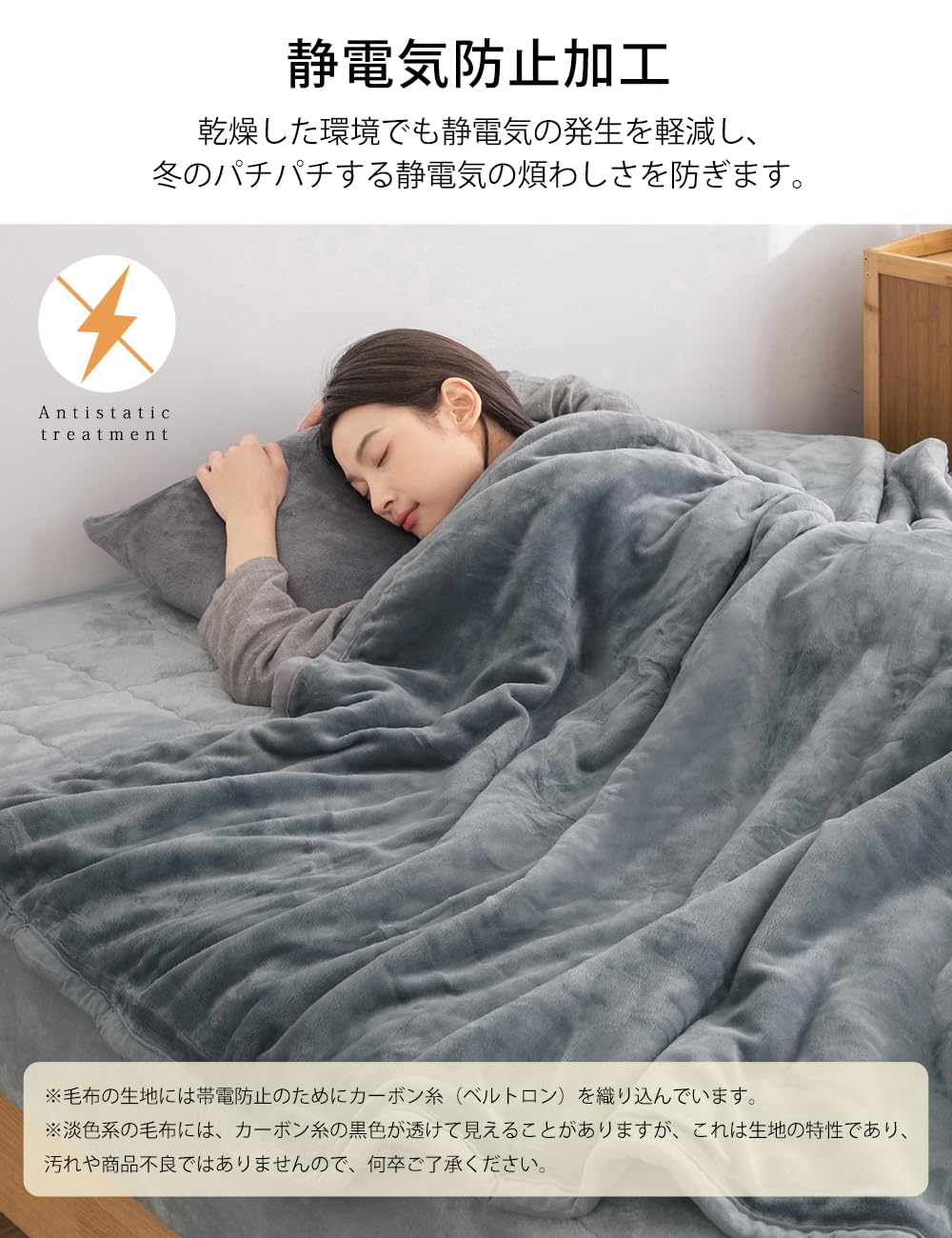?【静電気ケア】生地全体に帯電防止加工を施し、乾燥した冬でもパチパチ軽減。柔軟剤との相性も良く、洗うたびにふんわり感がアップ。静電気が苦手なお子様やペットとの共有にも安心です。