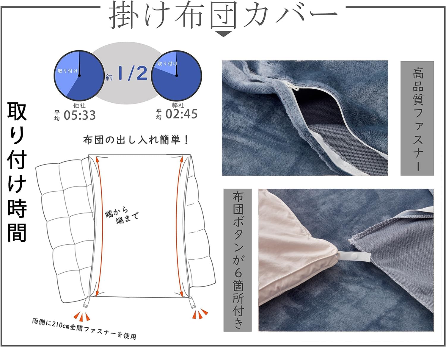 ??【2側全開ファスナー&6ヶ所紐付き】布団カバー シングルの端から端まで両側全開ファスナーを採用しており、ふとんの出し入れがしやすいです。使いやすい工夫をプラスです。普通の掛けふとんカバーより着脱が簡単です。の布団セットはスナップボタン式となっているので、布団についているループに紐を通しパチンと止めるだけ!シングル布団カバーがずれにくいです。