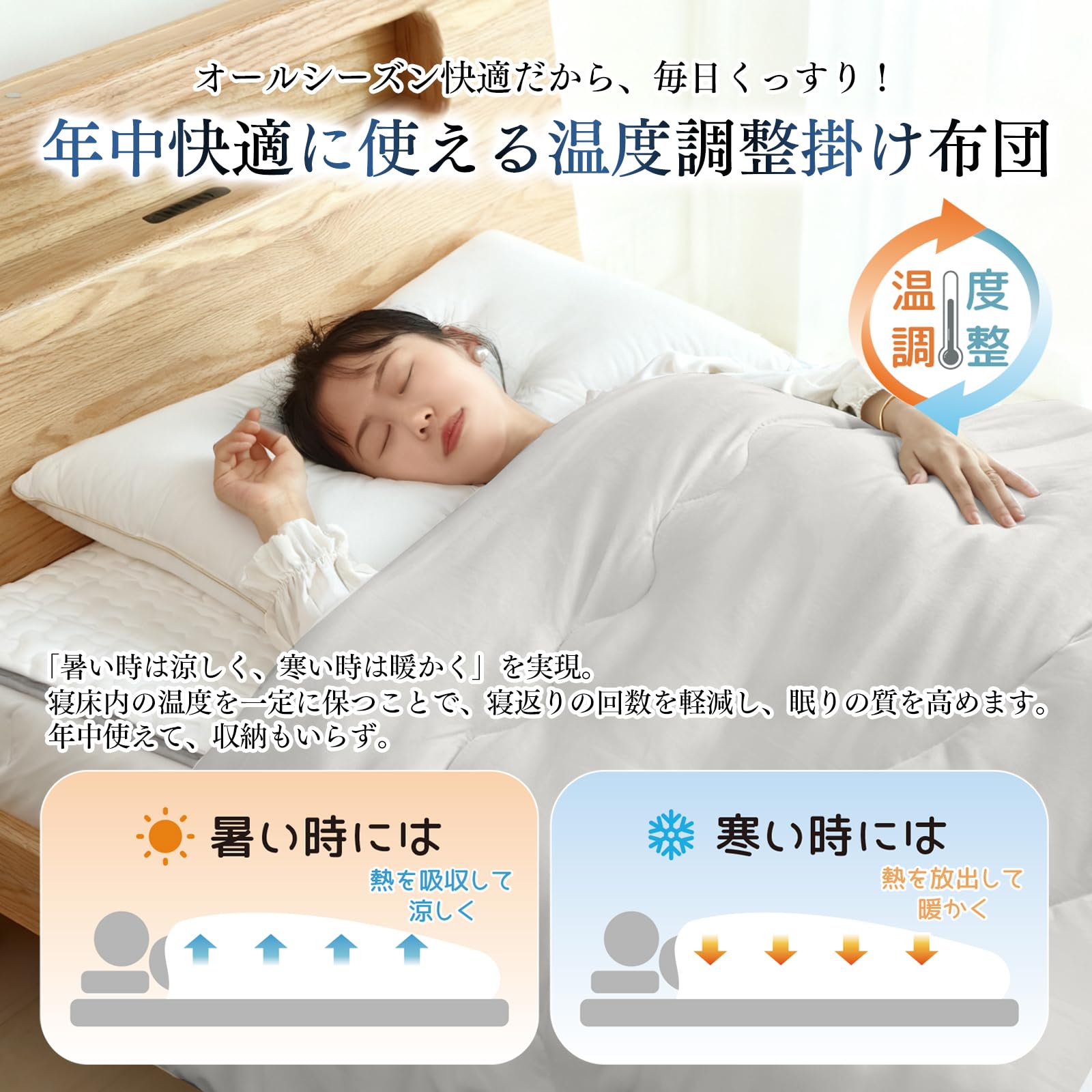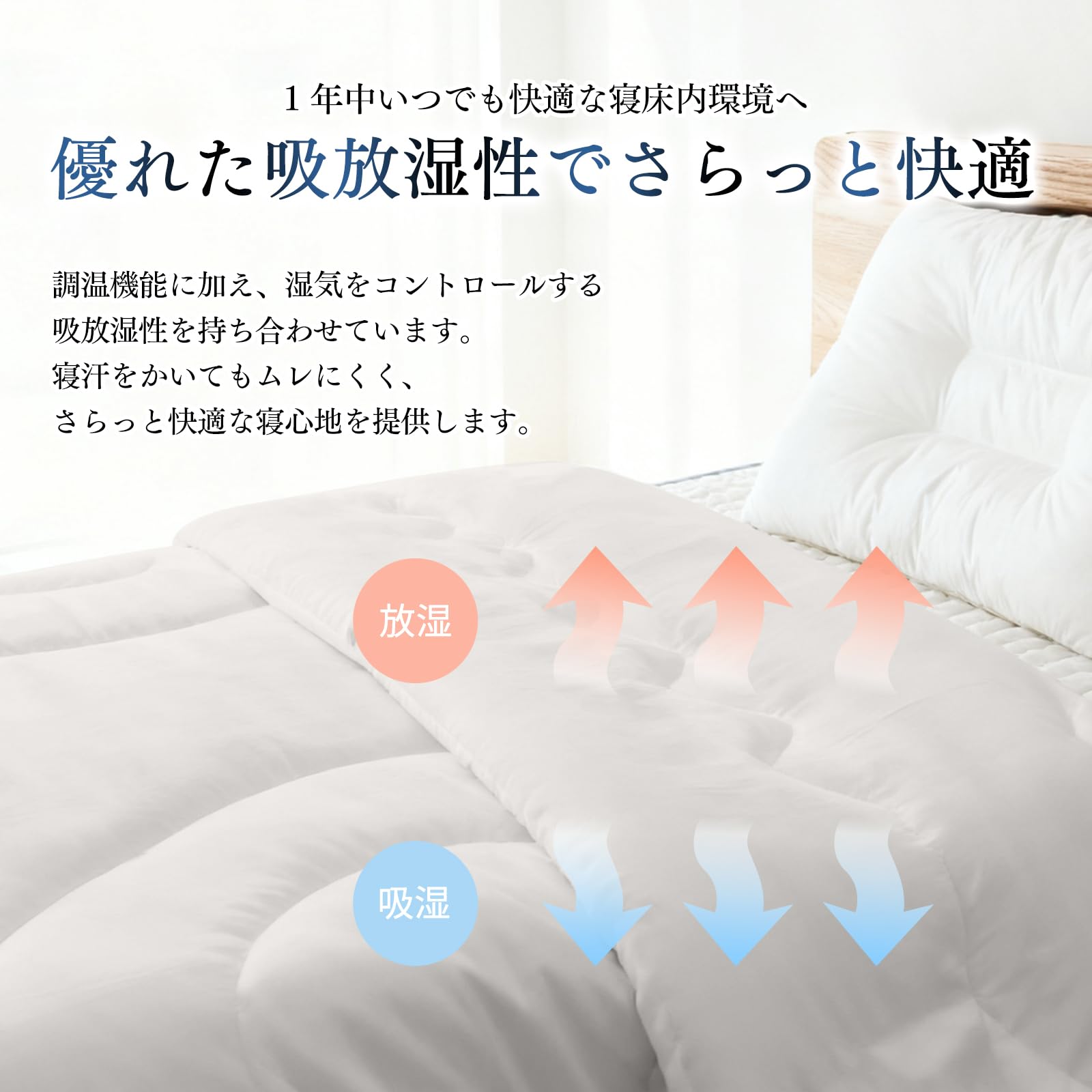 【優れた吸放湿性でさらっと快適】調温機能に加え、湿気をコントロールする優れた吸放湿性を備えています。寝汗をかいてもムレにくく、さらっとした快適な寝心地を提供します。調温機能と吸放湿性の両方を兼ね備えることで、オールシーズン快適にご利用いただけます。1 年中使用できるため、収納の手間が省けます。
