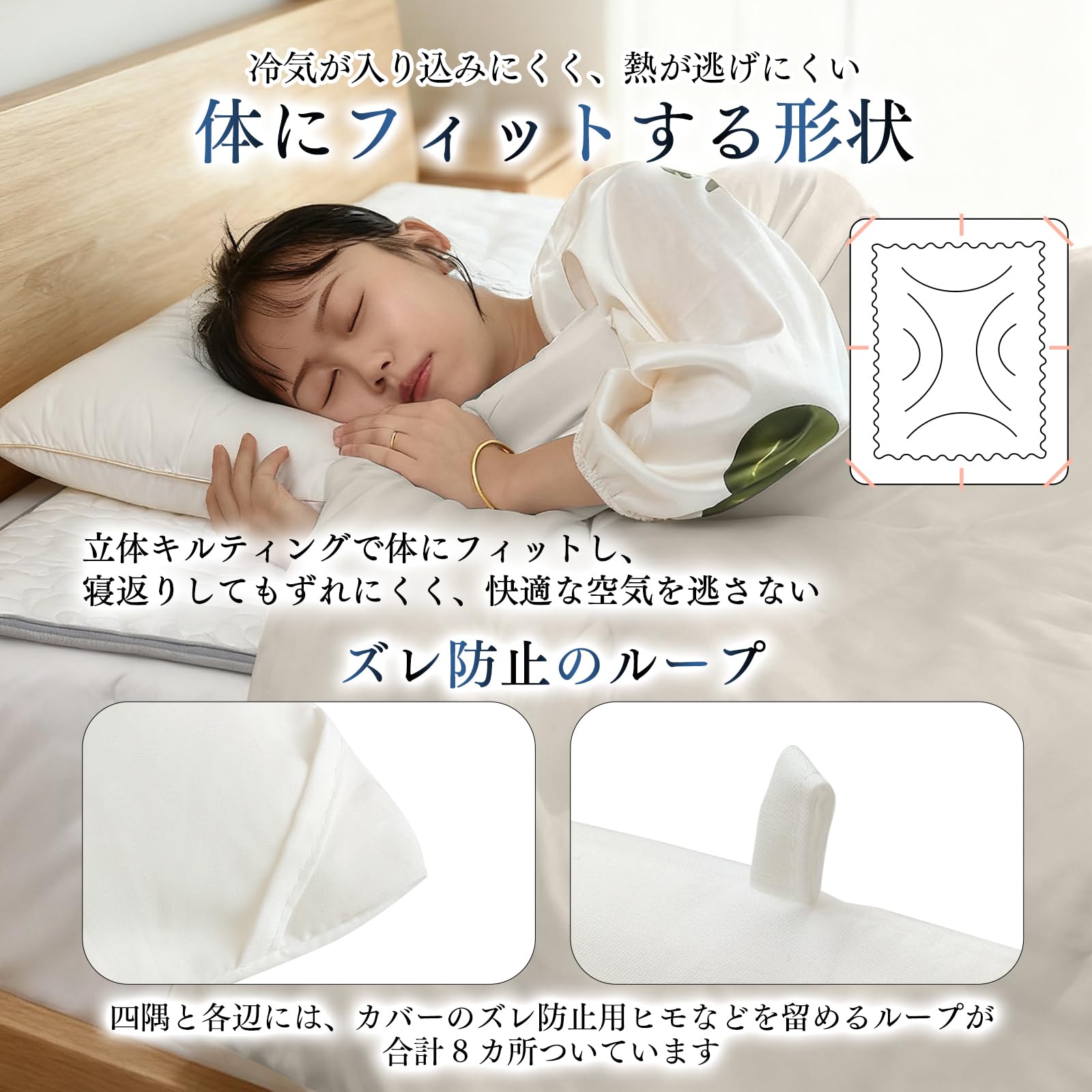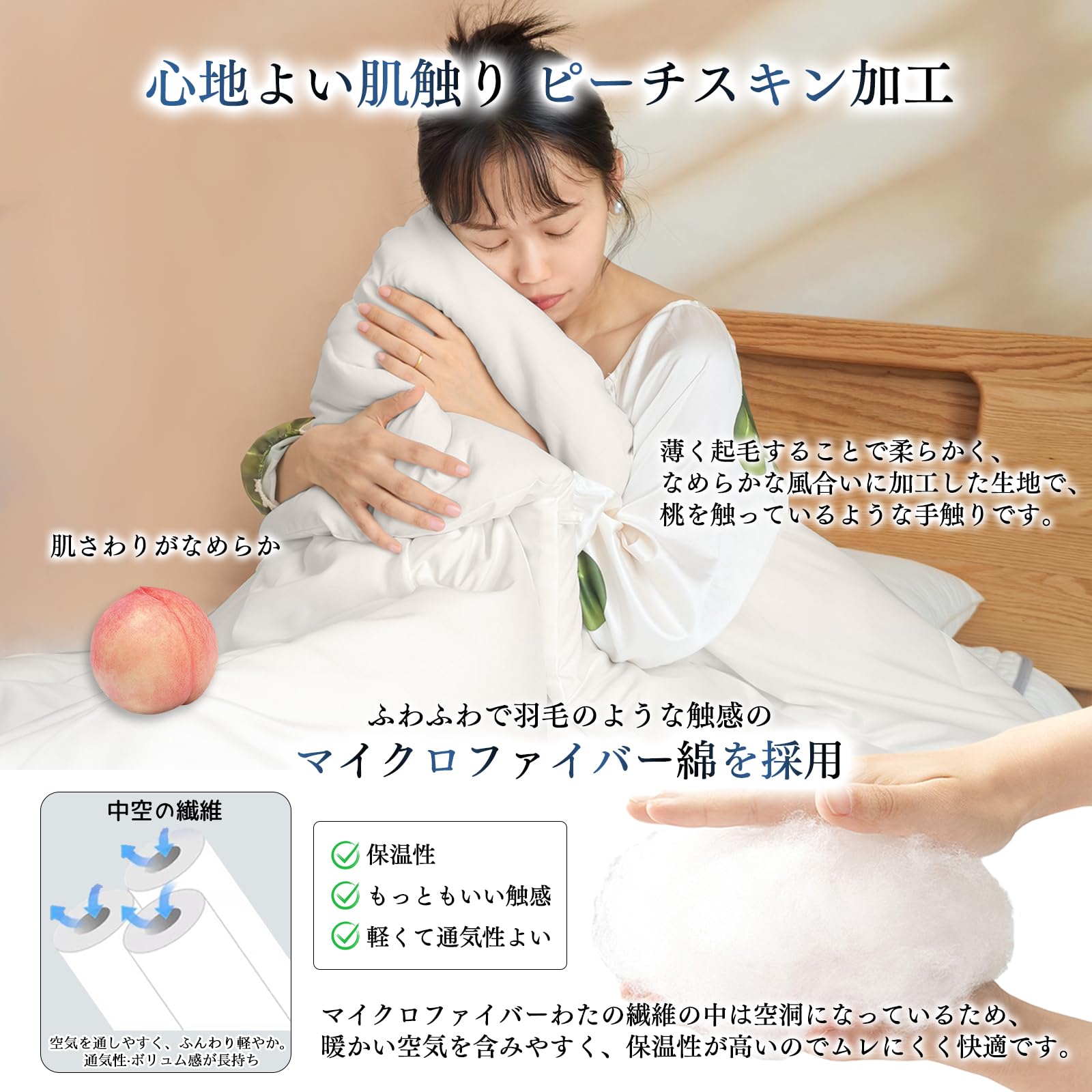【心地よい肌触り】ピーチスキン加工を表生地に施し、柔らかく滑らかな肌触りにしています。さらに、ふわふわで羽毛のような触感のマイクロファイバー綿を採用しています。繊維の中は空洞になっているため、暖かい空気を含みやすく、保温性が高いのでムレにくく快適です。【身体にフィットするキルト形状】身体のラインに沿った曲線形状のキルティングを採用しています。冷気の侵入を防ぎ、熱の逃げを抑えるため、寒い夜も快適に過ごせます。