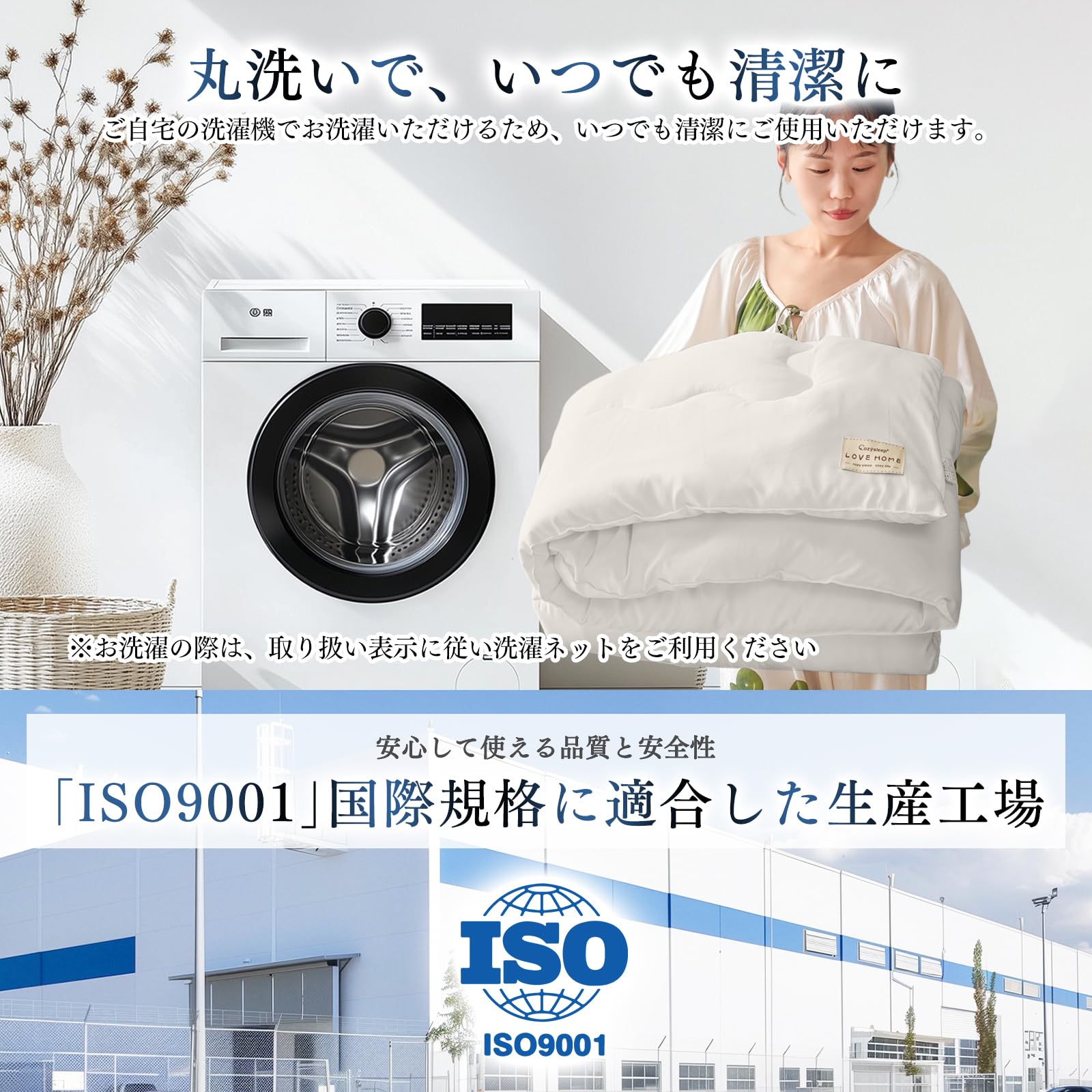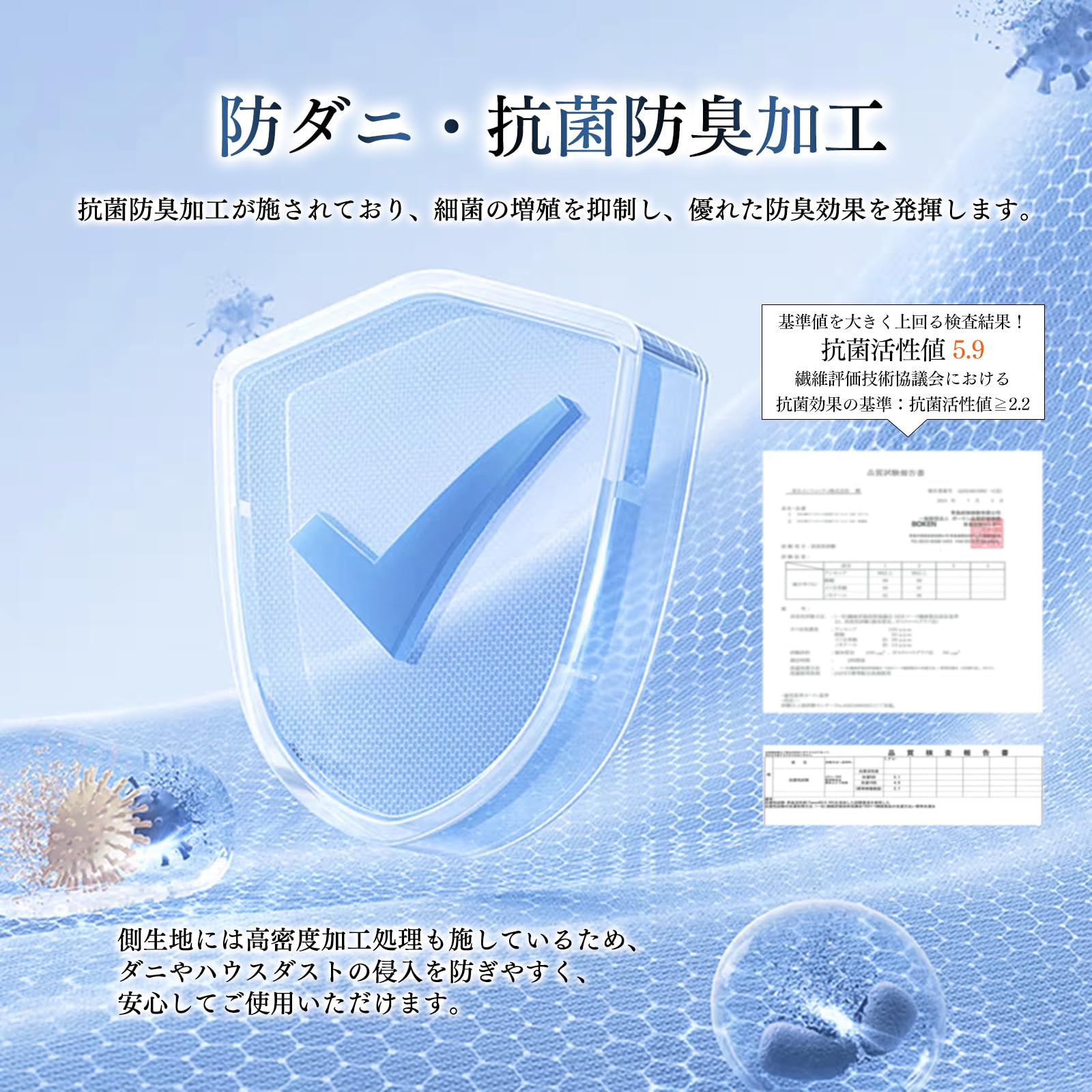 【快眠は清潔さから】抗菌防臭加工で、いつでも快適な環境を提供します。側生地には抗菌・防臭加工を施しています。発汗や皮脂の付着による不快な臭いの発生を防ぎ、清潔さを長く持続させます。お子様やアレルギー体質の方にも安心してお使いいただけます。さらに、側生地には高密度加工処理も施しているため、ダニやハウスダストが通りにくく、より安心です。洗濯機で丸洗い可能です。汗や皮脂の汚れ、気になる臭いも、洗濯機で丸洗いすることで除去できるため、いつでも清潔に保てます!(ネットをご使用の上、洗濯表示に従って洗濯してください)