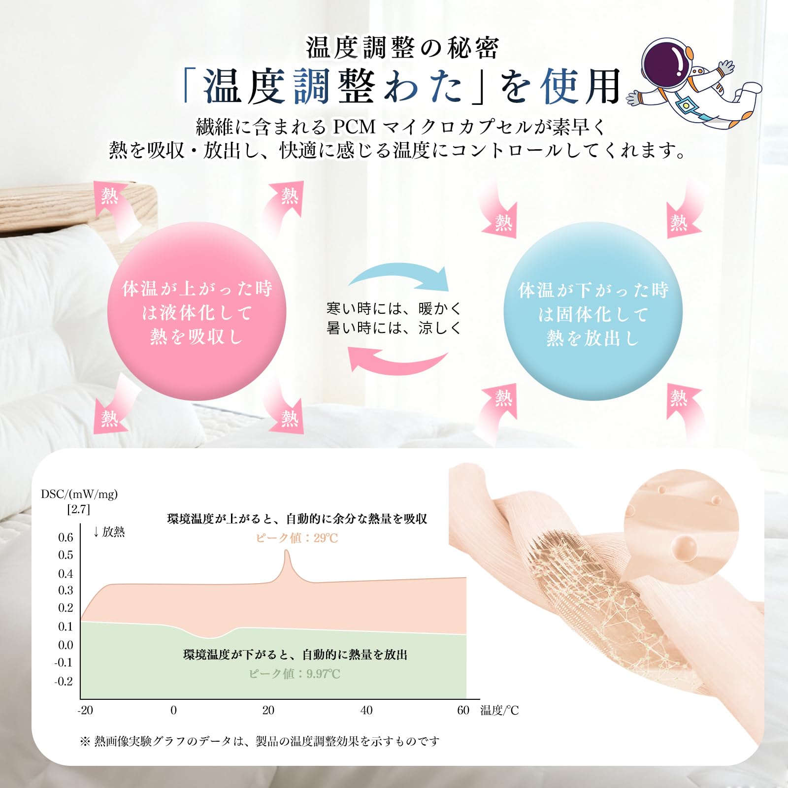 【温度調整掛け布団、年中快適】オールシーズン快適だから、毎日くっすり眠れる!「暑い時は涼しく、寒い時は暖かく」を実現。寝床内の温度を一定に保つことで、寝返りの回数を軽減し、眠りの質を高めます。温度調整の秘密:「温度調整わた」を使用。繊維に含まれる PCM マイクロカプセルが素早く熱を吸収・放出し、布団の中の温度を一定に保ちます。体温が上がった時は液体化して熱を吸収し、体温が下がった時は固体化して熱を放出します。