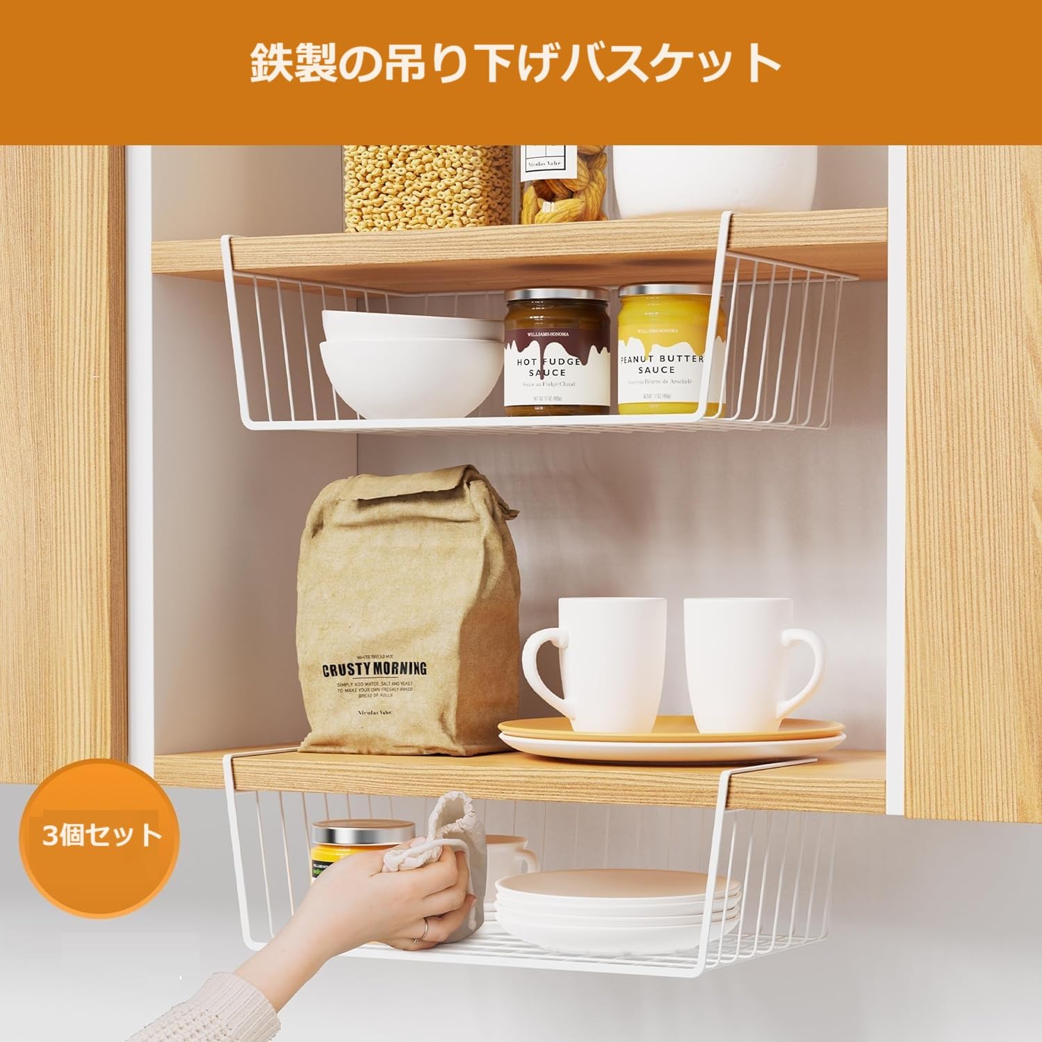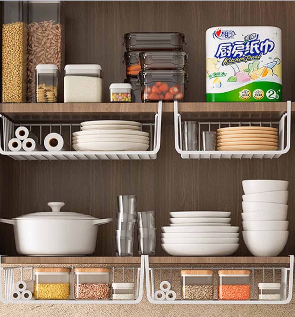【適用場合】:このハンギングバスケットはコップ、お皿、茶碗、箸、スプーン、タオル、本、文房具、調味料、化粧品などの小物を収納します。キッチン、キャビネット、クローゼット、本棚、デスク、お風呂場など、さまざまな場所で使われています。