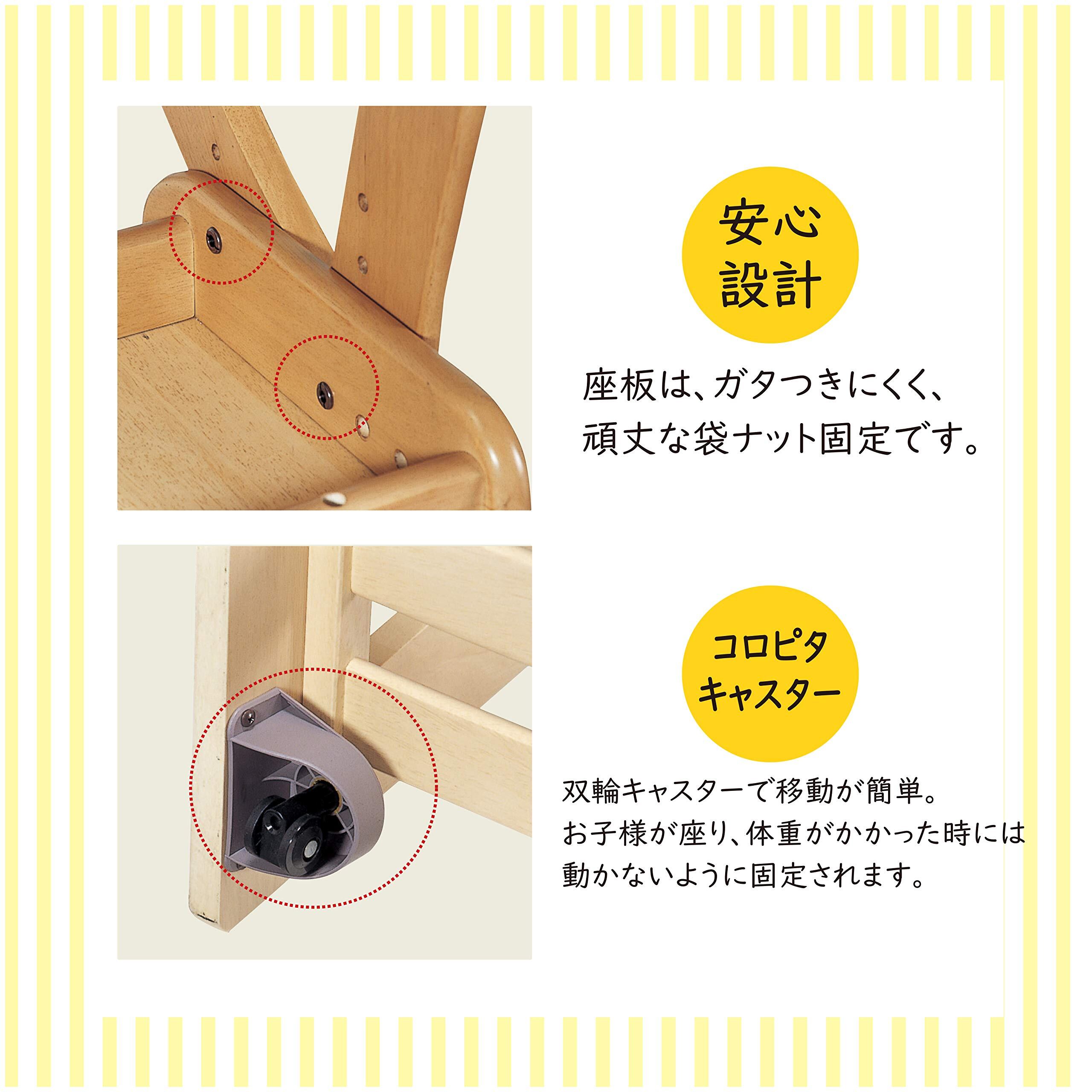 【4STEPチェア】成長に合わせて永く使えるチェアシリーズ。座面に角度をつけているので、前かがみになるのを防ぎます。