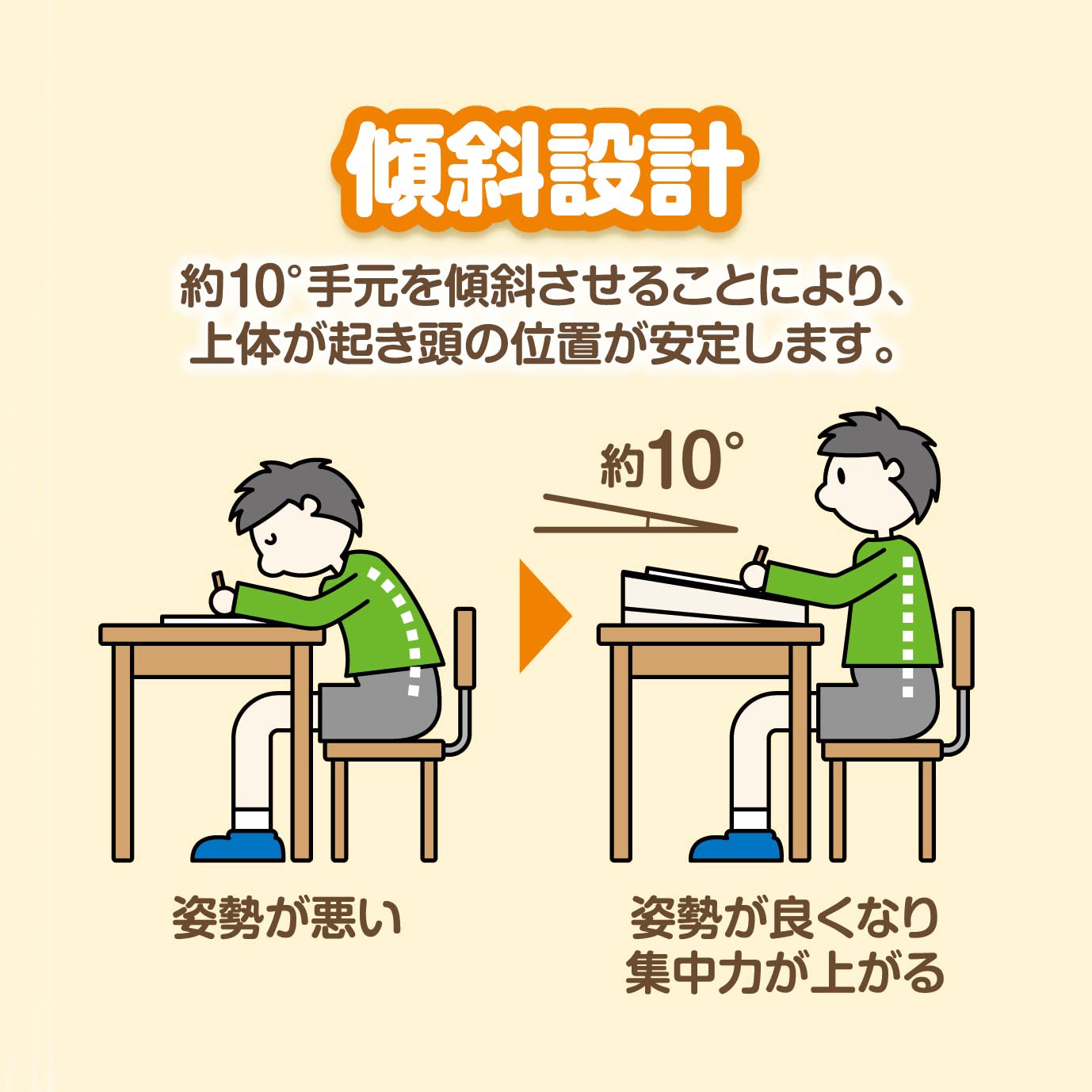 ■傾斜設計:約10°手元を安定させることにより、上体が起き、頭の位置が安定します。姿勢が良くなり、集中力もUP。