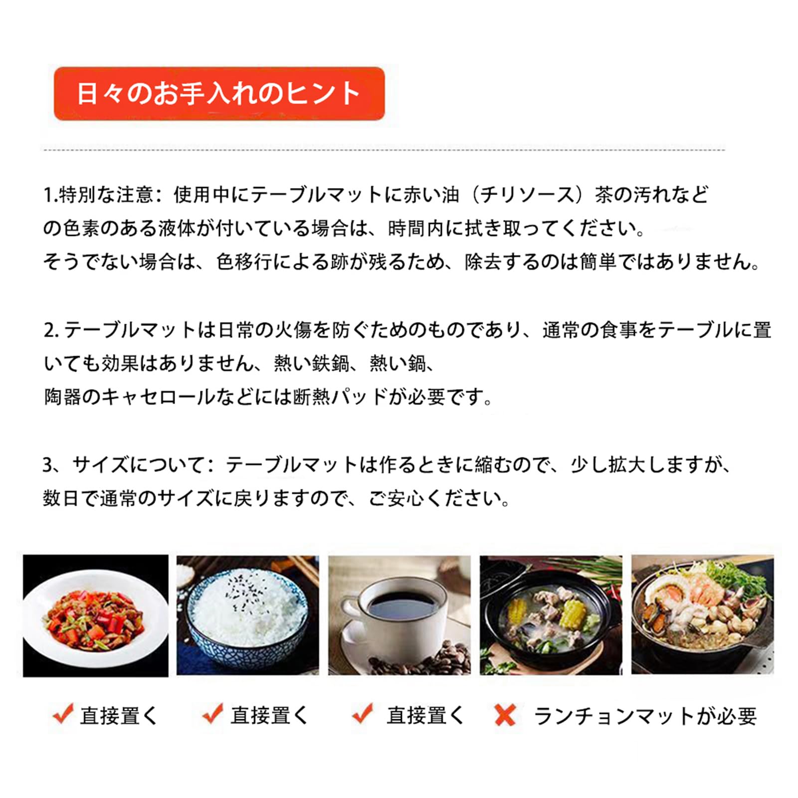 【高品質シリコン素材】高品質、安全、環境に優しいシリコン材料で、テーブルマットを受け取って開けたら、重いものを角に置いて24時間平らにすると、テーブルマットは平らになります。