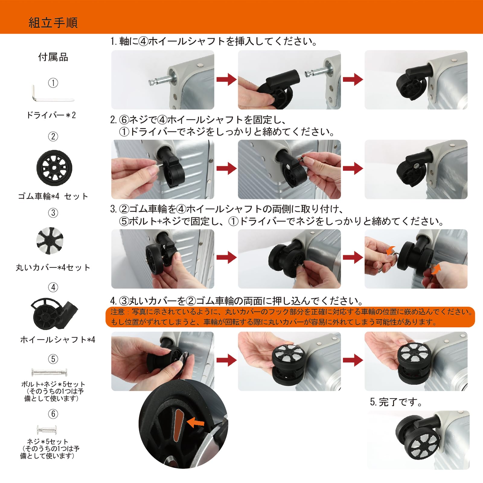 スーツケースではなく、スーツケースの交換用部品です。 また、キャスターが完全に外れて軸だけになっている場合に限り、お客様ご自身で取り付けが可能です。 キャスターがまだ外れていない状態では、交換はできかねますので、あらかじめご了承ください。