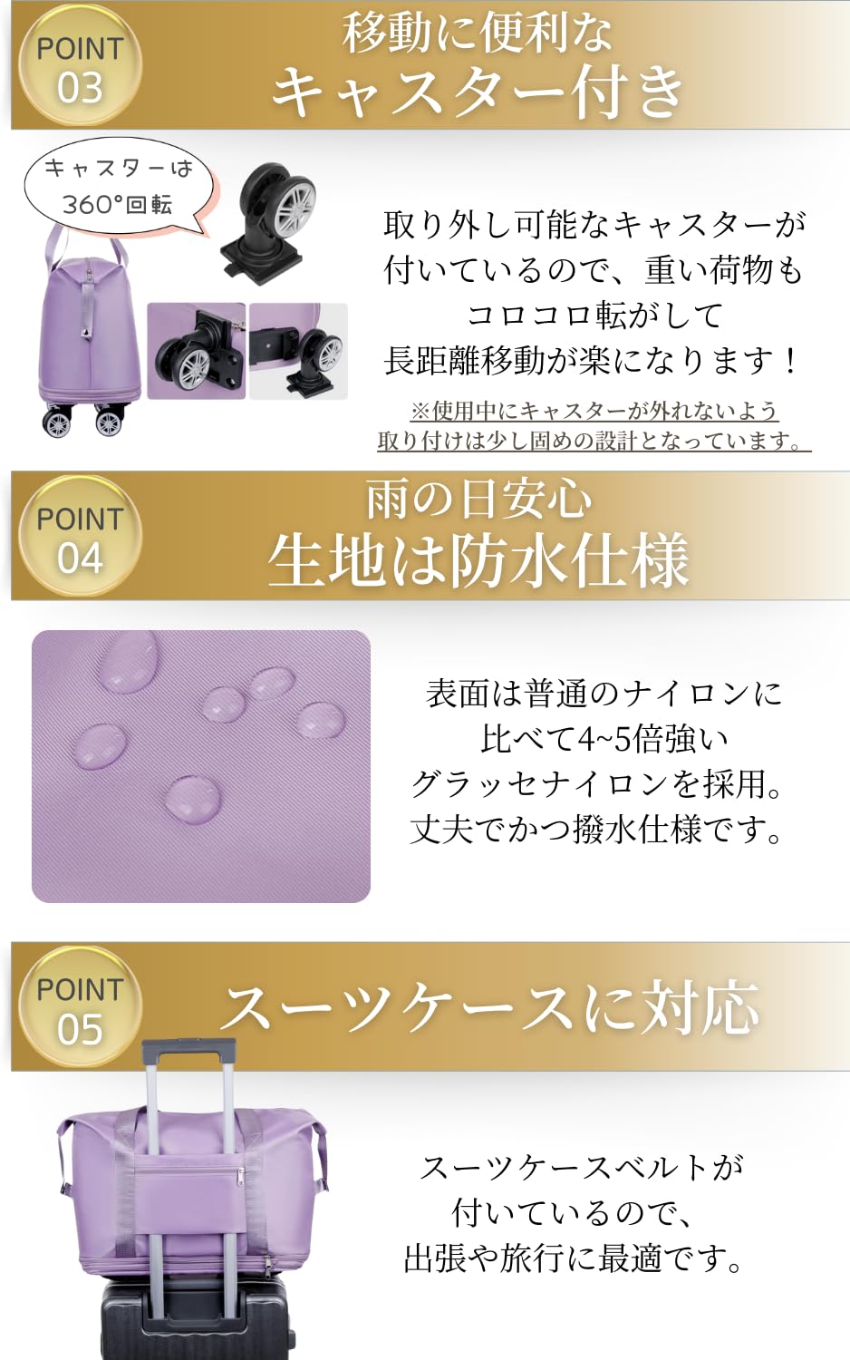 多用途デザイン: スーツケースの取っ手に通すことができるので、スーツケースの上に乗せても安定感があり、移動も楽々です。大容量なので、旅行はもちろんアウトドアや防災バッグ、入院の際のバッグとしても幅広く活躍します。