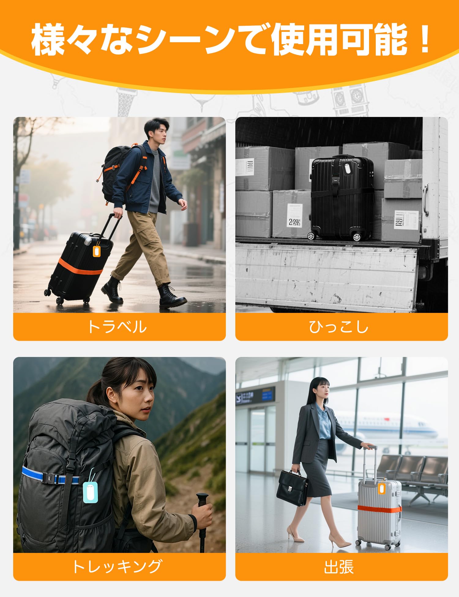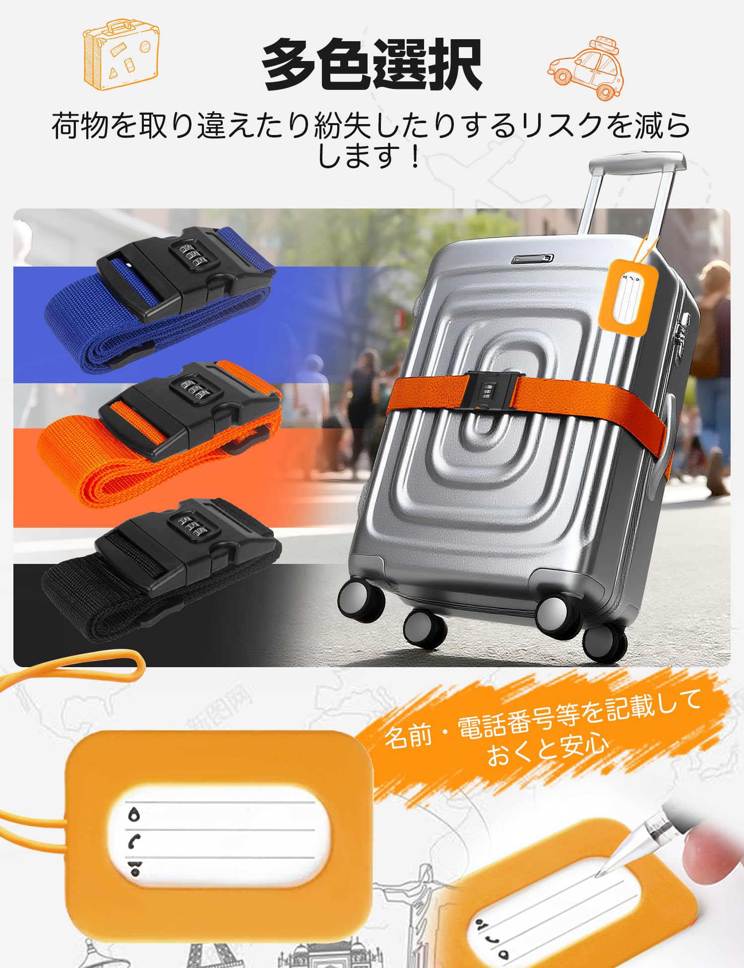 【目立つデザインで識別しやすく】色とりどりの3色から選べるカラーバリエーション。カラフルな荷ベルトで、お手元の荷物が一目でわかります。個性的なデザインが旅行を彩り、機能的で実用的。旅程全体をより快適にします。さらに、付属の荷物タグですぐに識別可能でます、メモは出し入れ可能なので違うメモを入れたいときにも入れ替えて使うことができます。
