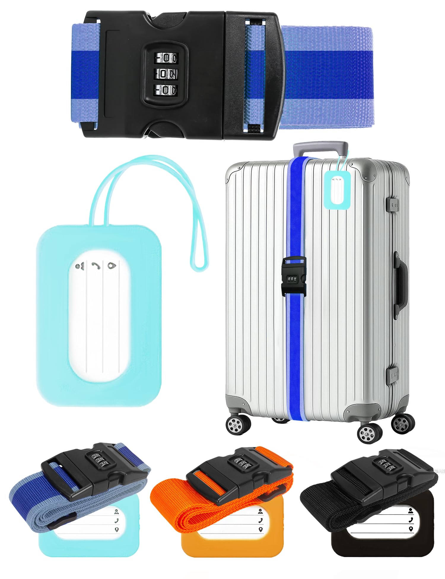 【新着特価】スーツケースベルト 鍵付き キャリーケース ベルト 軽量 3桁ダイヤル式 バンド 調整可能 I字型 固定ベルト 防犯 バゲージ破裂防止 ずり落ち防止 旅行/出張に最適 (ネイビーブルー 鍵付き+グリーン 荷物タグ)