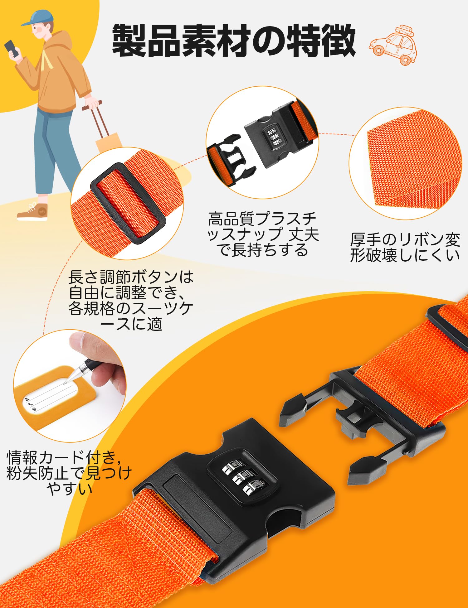 【防犯機能:】 このベルトは 3 桁の暗証番号を自由に設定でき、自分だけが簡単に解除できます。他人の無断開封を防止し、旅の安全を守ります。