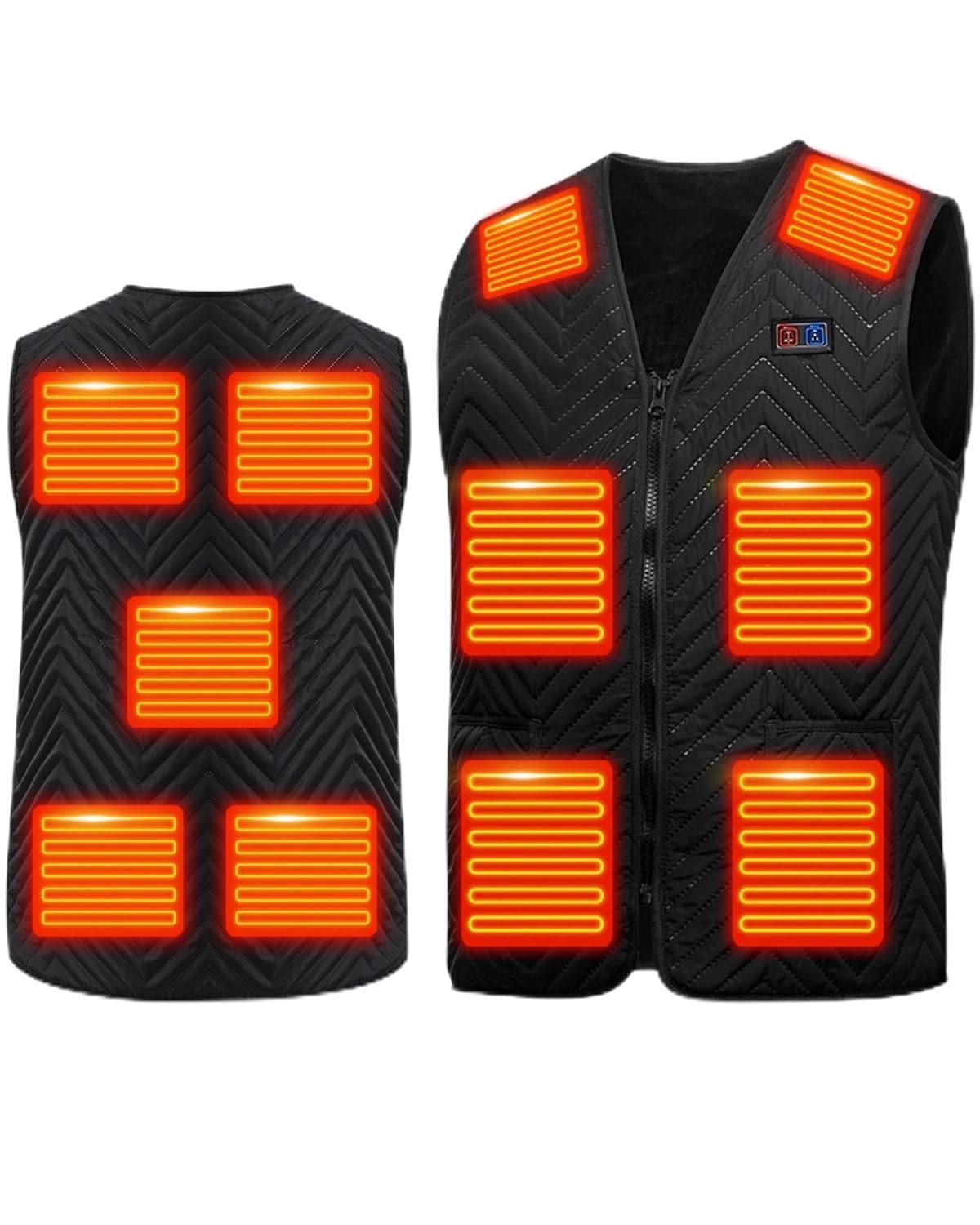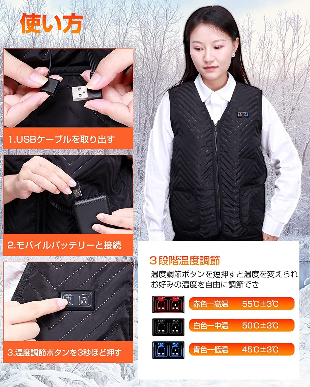 ??【前後11箇所加熱】前面に6つ、後ろに5つの加熱ヒーターを配置し、体を効率良く温めてくれる電熱ベストです。男女兼用で、通勤通学など普段使いはもちろん、登山などのアウトドア活動までも大活躍、冬を思う存分楽しむことができます。