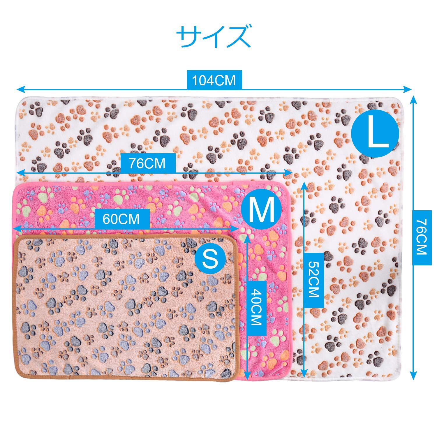 【3つのサイズ】肉球柄可愛いデザインのペット用ブランケット。3つのサイズ:S(60x40cm、各色1枚ずつ5枚セット)。M:(76x52cm、3枚セト)L:(104x76cm,2枚セット)。ご必要に応じて適切なサイズを選択できます。
