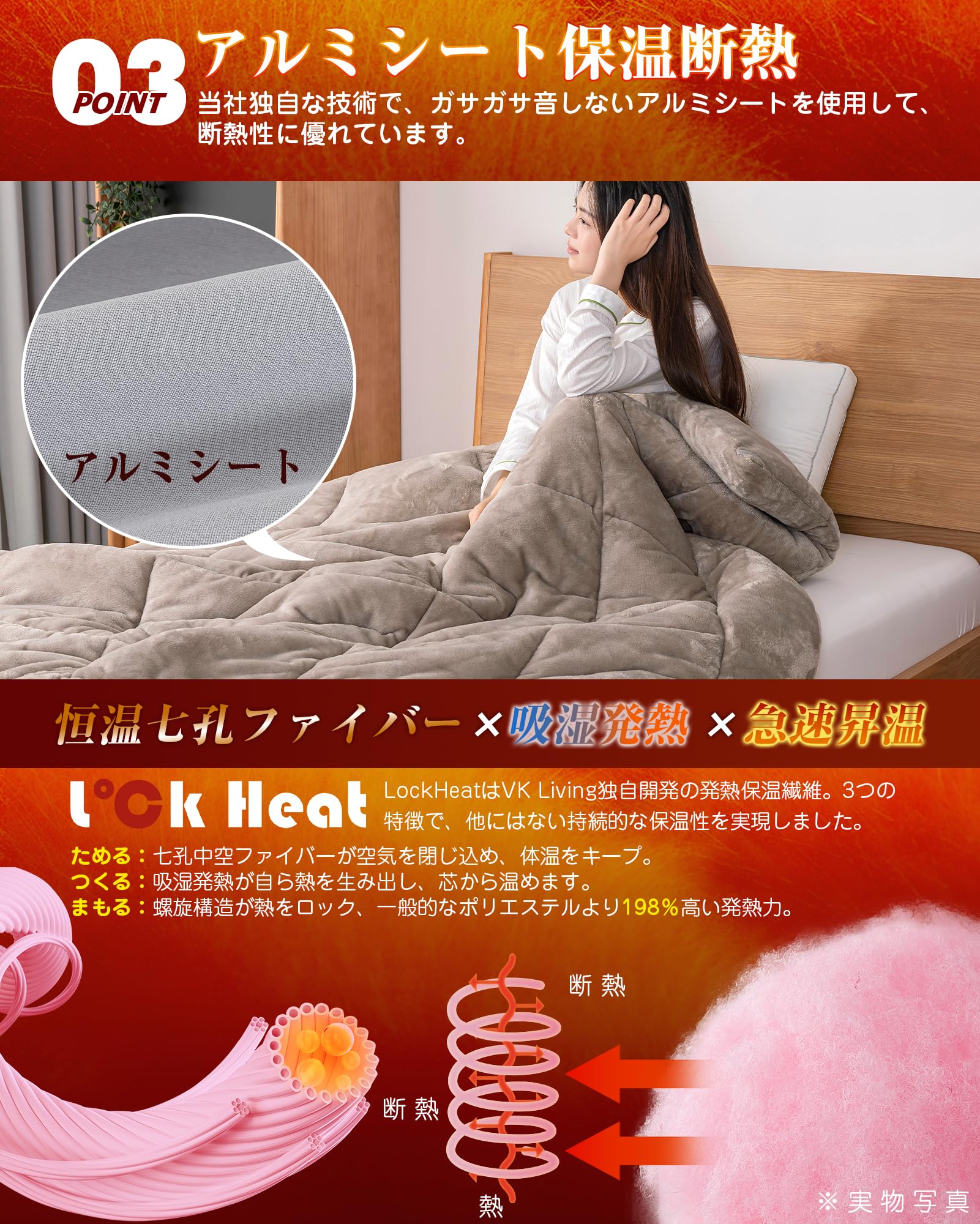 ??【LockHeat速暖発熱繊維】独自開発の発熱保温機能繊維「LockHeat」が、3つの特徴、恒温七孔ファイバー×吸湿発熱×急速昇温で、他にはない持続的な保温性を実現しました。七孔中空ファイバーが空気を閉じ込め、体温をキープ。吸湿発熱が自ら熱を生み出し、芯から温めます。 螺旋構造が熱をロック、一般的なポリエステルより198%高い発熱力。朝まで続く、深いぬくもりに包まれます。