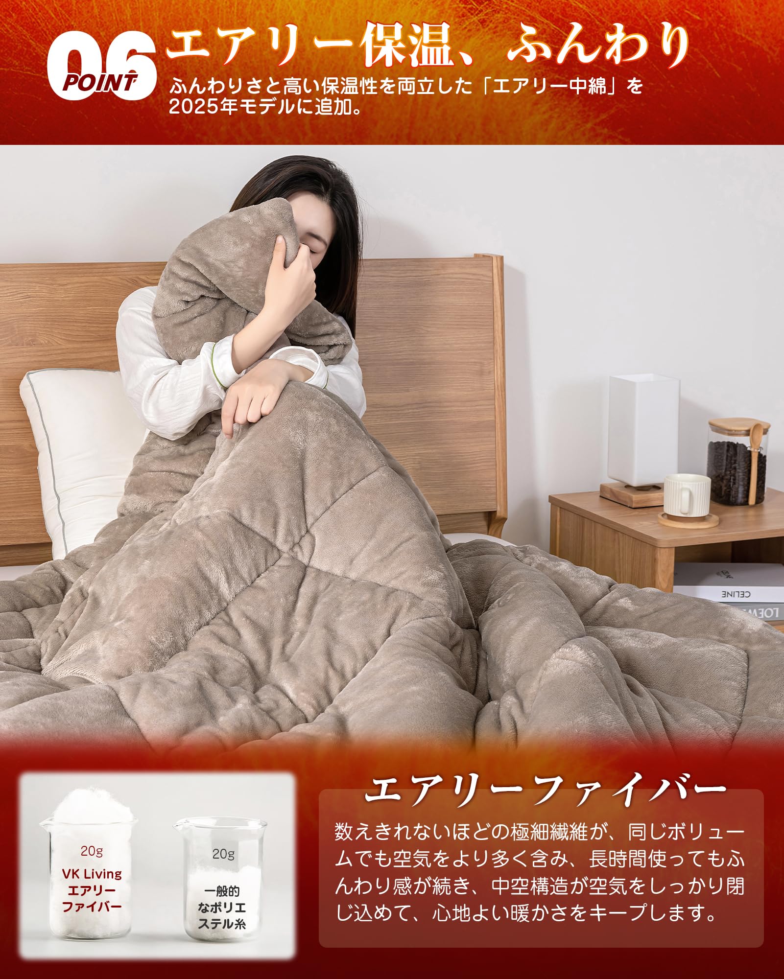 ??【エアリー中綿】VK Livingは保温の概念を進化させます。ふんわりさと高い保温性を両立した「エアリー中綿」を2025年モデルに追加。数えきれないほどの極細繊維が、同じボリュームでも空気をより多く含み、長時間使ってもふんわり感が続き、中空構造が空気をしっかり閉じ込めて、心地よい暖かさをキープします。
