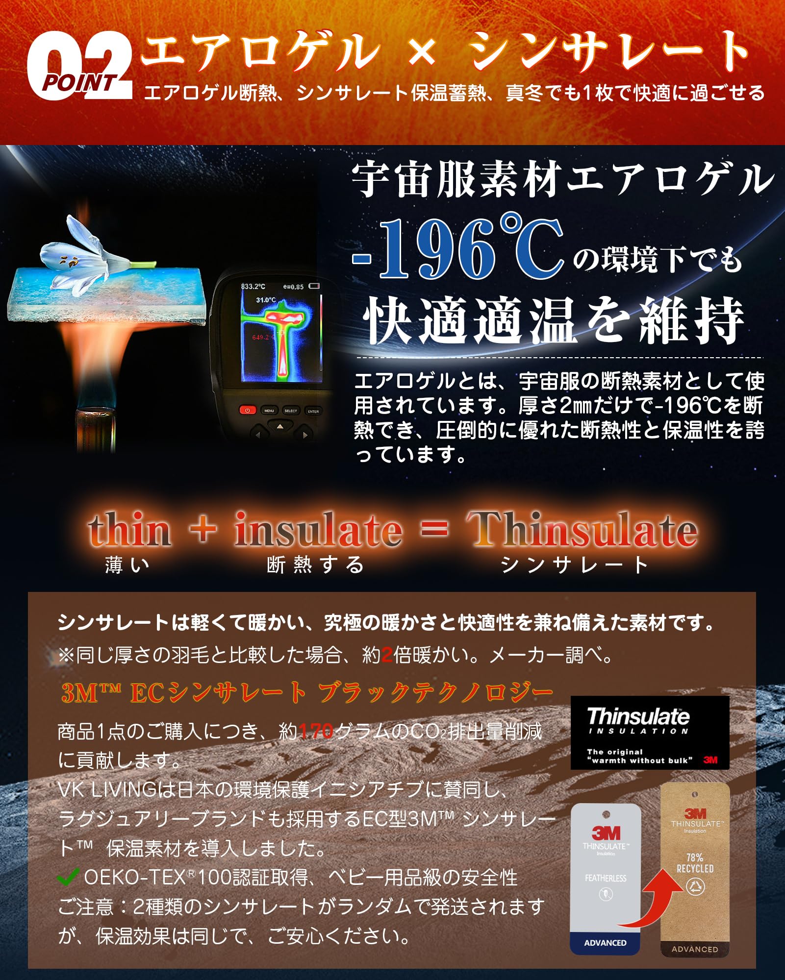??【シンサレート全面使用】シンサレートは軽くて暖かい、究極の暖かさと快適性を兼ね備えた素材です。同じ厚さの羽毛と比較した場合、約2倍暖かい。VK LIVINGは日本の環境保護イニシアチブに賛同し、2025年からラグジュアリーブランドも採用するEC型3M シンサレート 保温素材を導入しました。商品1点のご購入につき、約170グラムのCO?排出量削減に貢献します。ぬくもりとエコの調和を実現します。ご注意:2種類のシンサレートがランダムで発送されますが、保温効果は同じで、ご安心ください。