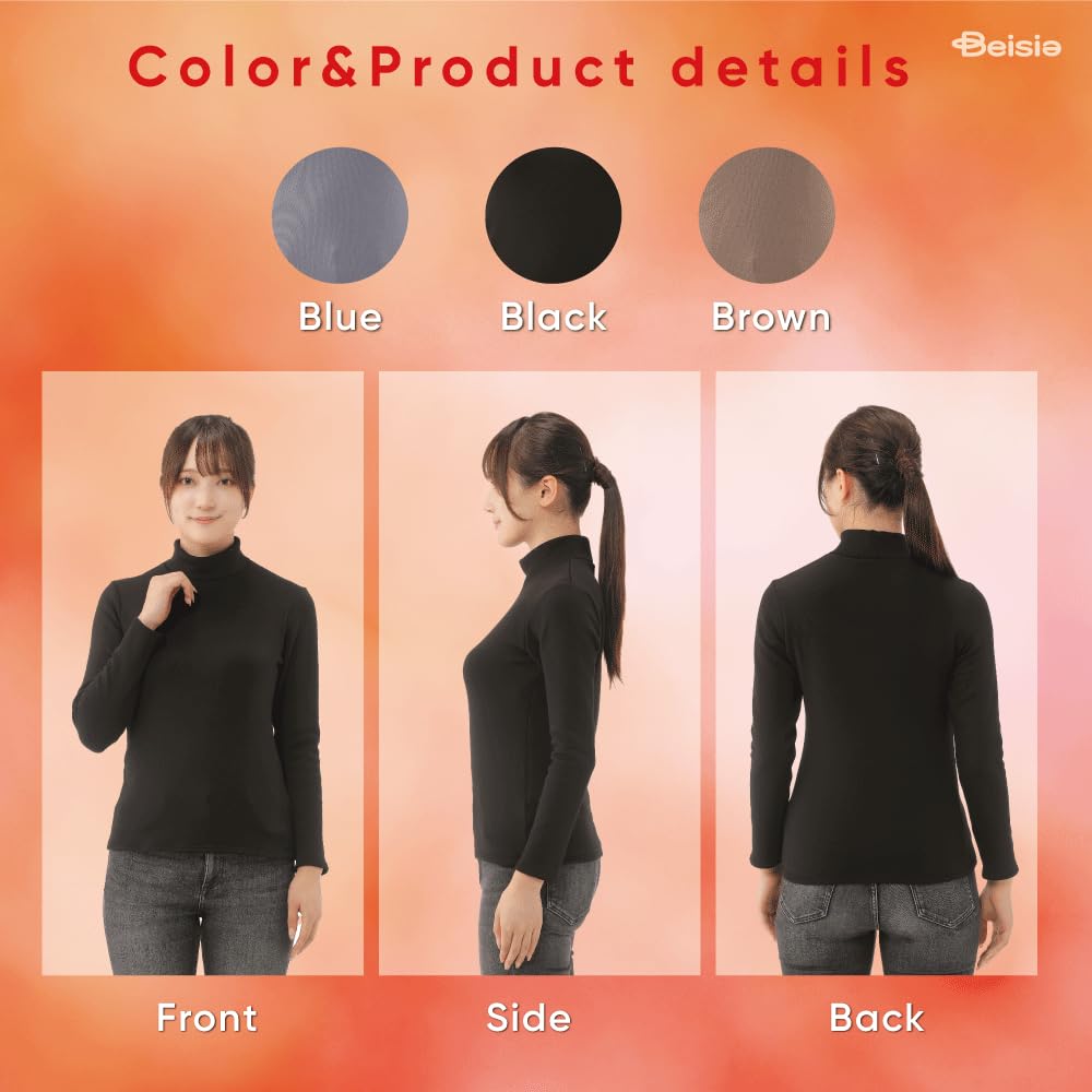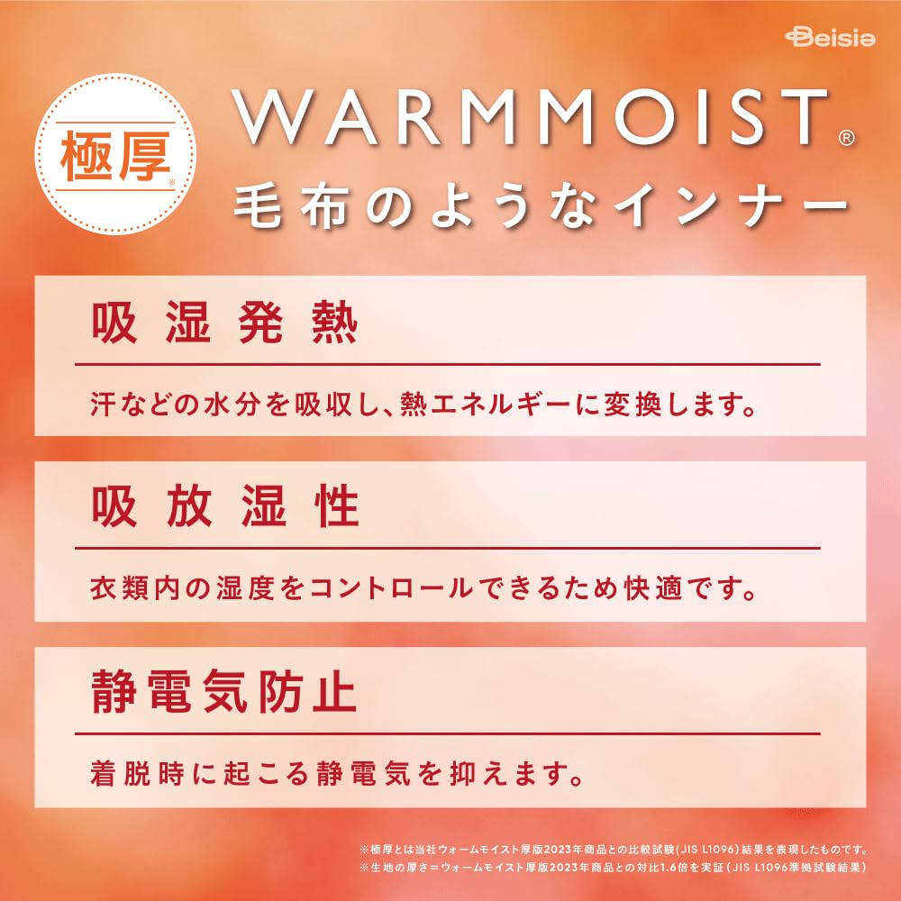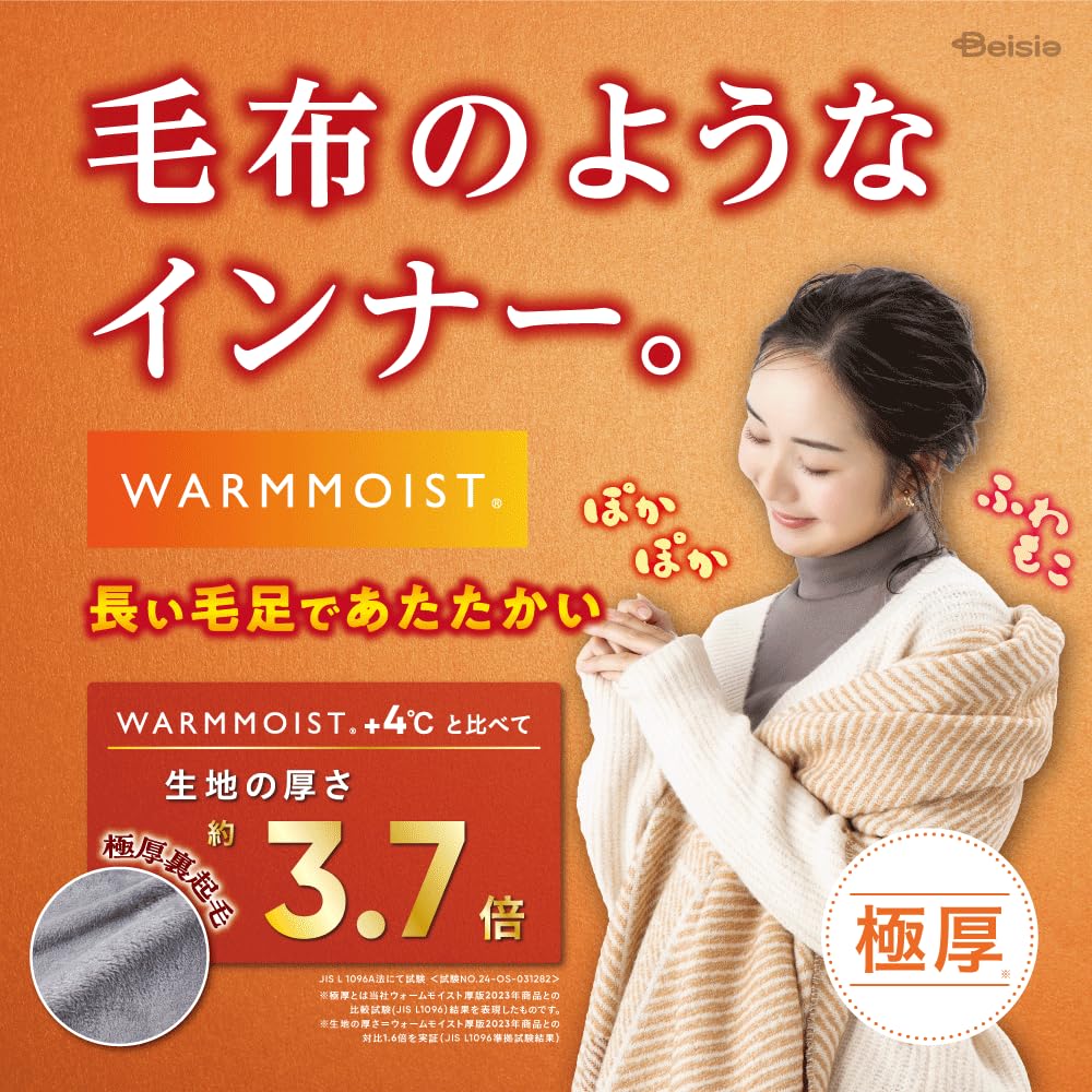 [ベイシア] WARMMOIST 毛布 2024(厚版) 婦人 ハイネック 【ウォームモイスト 毛布のようなインナー】ふわもこの長い毛足であたたかい♪ WARMMOIST +4℃と比べても生地の厚さ約3.7倍!極厚裏起毛使用! 【毛布のようなインナーの秘密】吸湿発熱性に優れた糸を用いた素材を使用しており、身体から出る水蒸気と反応して発熱することで、あたたかく過ごすことができます。 【吸放湿性】衣服内の湿度をコントロールできるため快適です♪ テスト