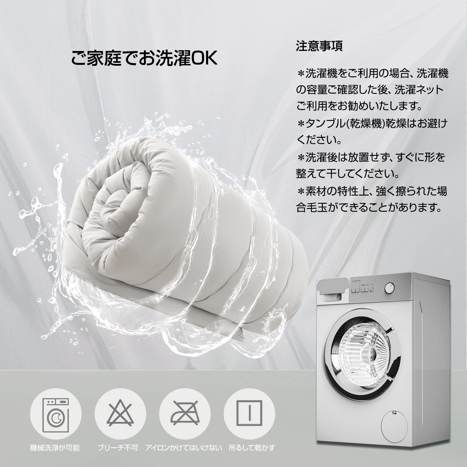 ??①商品サイズ:幅約150×奥行約210cm(シングルサイズ)②商品重量:約2.3kg③材質/表地:ポリエステル100% (ピーチスキン加工)、詰め物(重量:1.6kg)、上層部:ポリエステル100%、下層部:ポリエステル100%④カバー取り付け紐数:8カ所 ⑤お手入れ方法:お洗濯の際は10kg以上用の洗濯機を使用するとか、手洗いとかしてください。